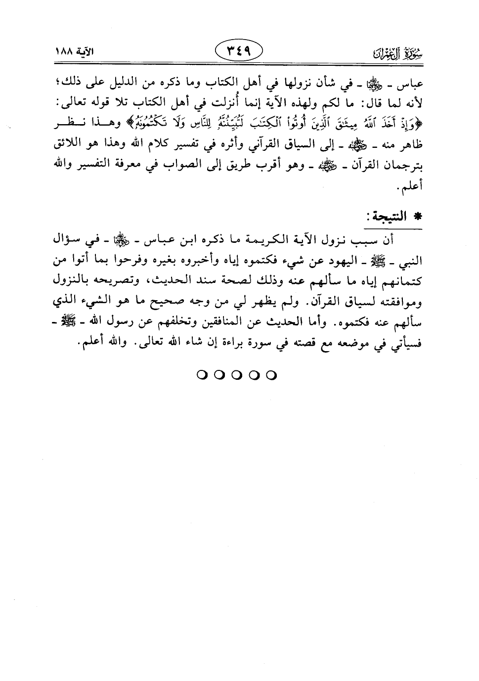 عباس - رَضِيَ اللَّهُ عَنْهُمَا - في شأن نزولها في أهل الكتاب وما ذكره من الدليل على ذلك؛ لأنه لما قال: ما لكم ولهذه الآية إنما أُنزلت في أهل الكتاب تلا قوله تعالى: (وَإِذْ أَخَذَ اللَّهُ مِيثَاقَ الَّذِينَ أُوتُوا الْكِتَابَ لَتُبَيِّنُنَّهُ لِلنَّاسِ وَلَا تَكْتُمُونَهُ) وهذا نظر ظاهر منه - رَضِيَ اللَّهُ عَنْهُ - إلى السياق القرآني وأثره في تفسير كلام اللَّه وهذا هو اللائق بترجمان القرآن - رَضِيَ اللَّهُ عَنْهُ - وهو أقرب طريق إلى الصواب في معرفة التفسير واللَّه أعلم.