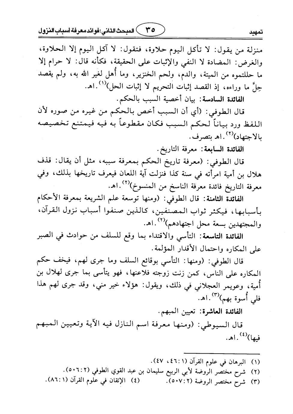 الفائدة الثامنة: قال الطوفي: (ومنها توسعة علم الشريعة بمعرفة الأحكام بأسبابها، فيكثر ثواب المصنفين، كالذين صنفوا أسباب نزول القرآن، والمجتهدين بسعة محل اجتهادهم). اهـ.