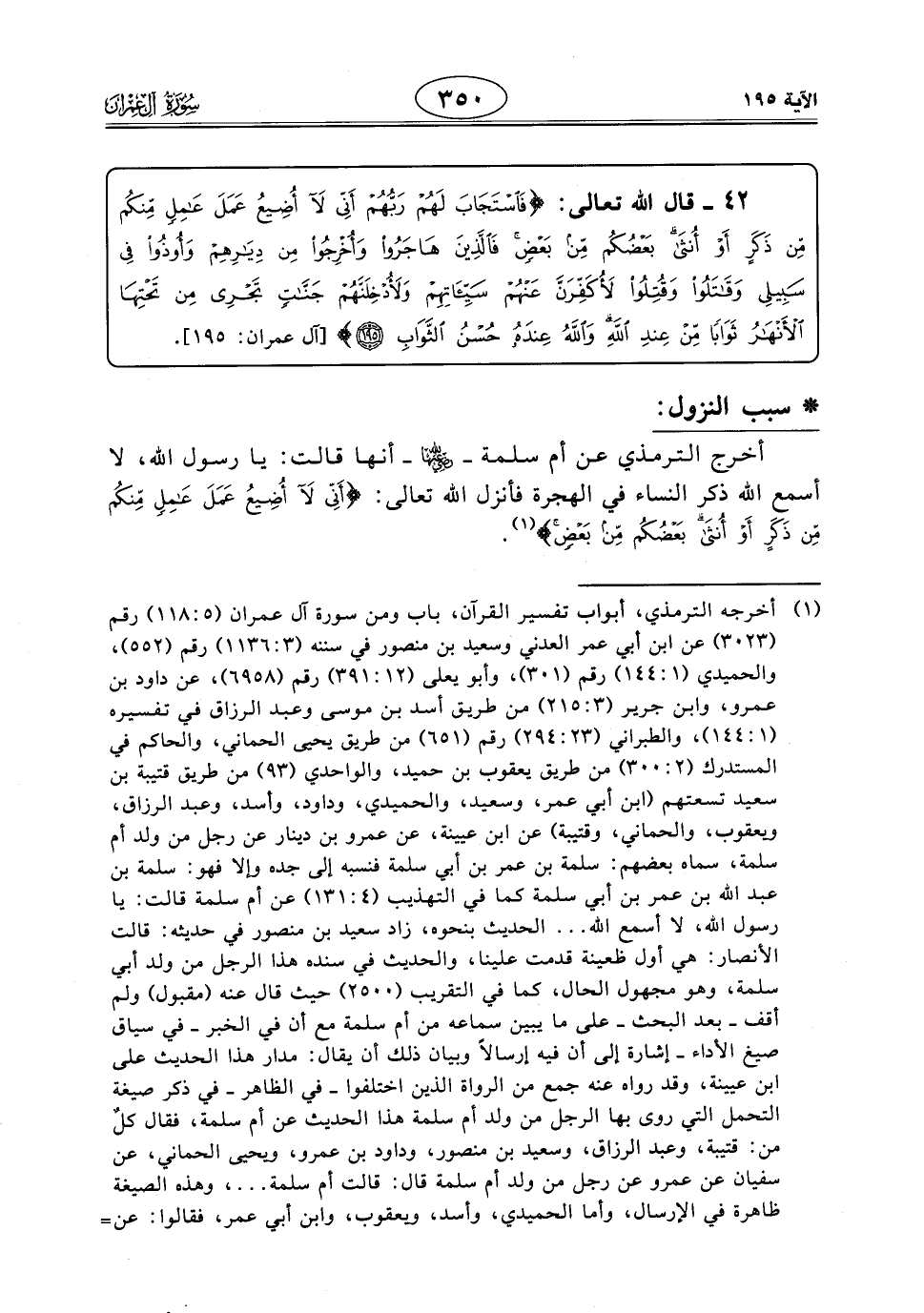أخرج الترمذي عن أم سلمة - رضي الله عنها - أنها قالت: يا رسول الله، لا أسمع الله ذكر النساء في الهجرة فأنزل الله تعالى: (أَنِّي لَا أُضِيعُ عَمَلَ عَامِلٍ مِنْكُمْ مِنْ ذَكَرٍ أَوْ أُنْثَى بَعْضُكُمْ مِنْ بَعْضٍ).