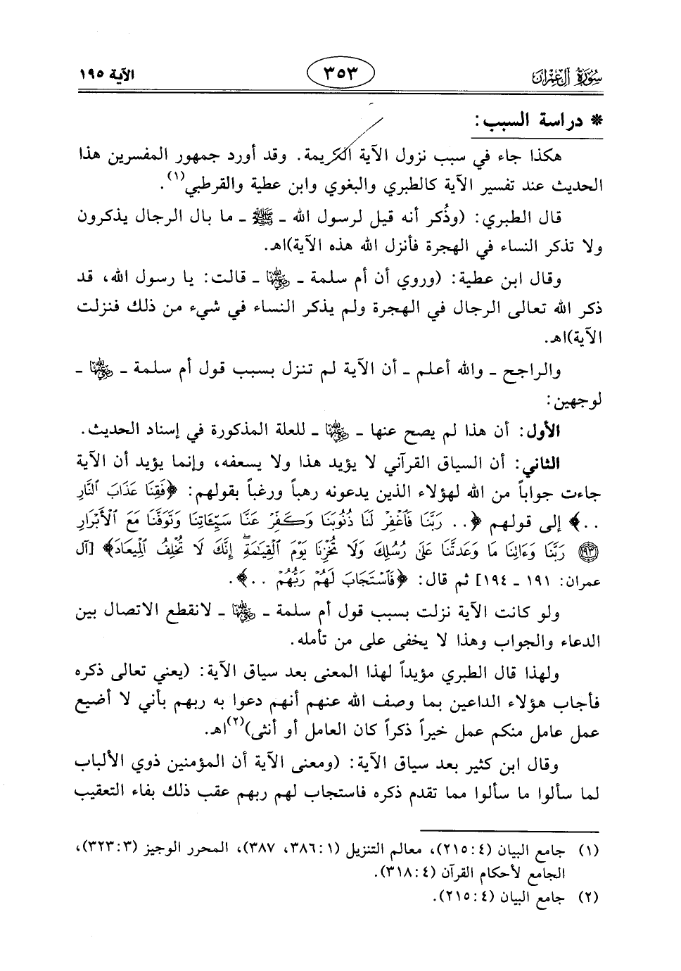 الثاني: أن السياق القرآني لا يؤيد هذا ولا يسعفه، وإنما يؤيد أن الآية جاءت جواباً من اللَّه لهؤلاء الذين يدعونه رهباً ورغباً بقولهم: (فَقِنَا عَذَابَ النَّارِ .. ) إلى قولهم .. (رَبَّنَا إِنَّنَا سَمِعْنَا مُنَادِيًا يُنَادِي لِلْإِيمَانِ أَنْ آمِنُوا بِرَبِّكُمْ فَآمَنَّا رَبَّنَا فَاغْفِرْ لَنَا ذُنُوبَنَا وَكَفِّرْ عَنَّا سَيِّئَاتِنَا وَتَوَفَّنَا مَعَ الْأَبْرَارِ (193) رَبَّنَا وَآتِنَا مَا وَعَدْتَنَا عَلَى رُسُلِكَ وَلَا تُخْزِنَا يَوْمَ الْقِيَامَةِ إِنَّكَ لَا تُخْلِفُ الْمِيعَادَ (194).