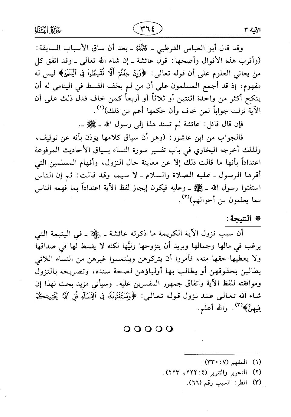 أن سبب نزول الآية الكريمة ما ذكرته عائشة - رضي الله عنها - في اليتيمة التي يرغب في مالها وجمالها ويريد أن يتزوجها وليُّها لكنه لا يقسط لها في صداقها ولا يعطيها حقها منه، فأمروا أن يتركوهن ويلتمسوا غيرهن من النساء اللاتي يطالبن بحقوقهن أو يطالب بها أولياؤهن لصحة سنده، وتصريحه بالنزول وموافقته للفظ الآية واتفاق جمهور المفسرين عليه. وسيأتي مزيد بحث لهذا إن شاء الله تعالى عند نزول قوله تعالى: (وَيَسْتَفْتُونَكَ فِي النِّسَاءِ قُلِ اللَّهُ يُفْتِيكُمْ فِيهِنَّ). واللَّه أعلم.