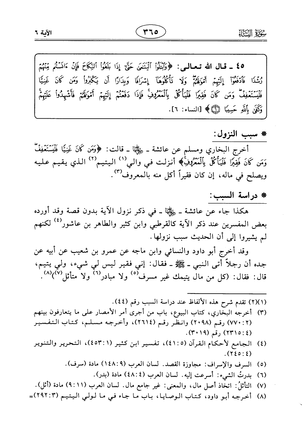 أخرج البخاري ومسلم عن عائشة - رضي الله عنها - قالت: (وَمَنْ كَانَ غَنِيًّا فَلْيَسْتَعْفِفْ وَمَنْ كَانَ فَقِيرًا فَلْيَأْكُلْ بِالْمَعْرُوفِ) أنزلت في والي اليتيم الذي يقيم عليه ويصلح في ماله، إن كان فقيراً أكل منه بالمعروف.