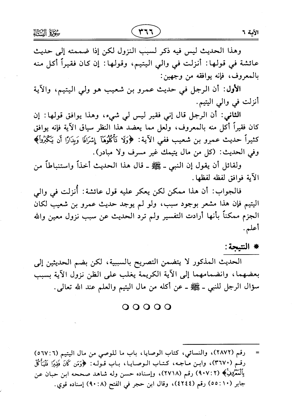 الثاني: أن الرجل قال إني فقير ليس لي شيء، وهذا يوافق قولها: إن كان فقيرًا أكل منه بالمعروف، ولعل مما يعضد هذا النظر سياق الآية فإنه يوافق كثيرًا حديث عمرو بن شعيب ففي الآية: (وَلَا تَأْكُلُوهَا إِسْرَافًا وَبِدَارًا أَنْ يَكْبَرُوا) وفي الحديث: (كل من مال يتيمك غير مسرف ولا مبادر).