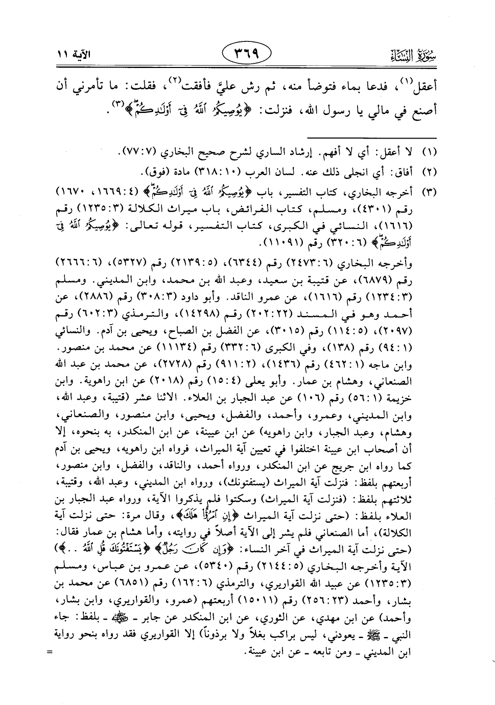 أعقل، فدعا بماء فتوضأ منه، ثم رش عليَّ فأفقت، فقلت: ما تأمرني أن أصنع في مالي يا رسول اللَّه، فنزلت: (يُوصِيكُمُ اللَّهُ فِي أَوْلَادِكُمْ).