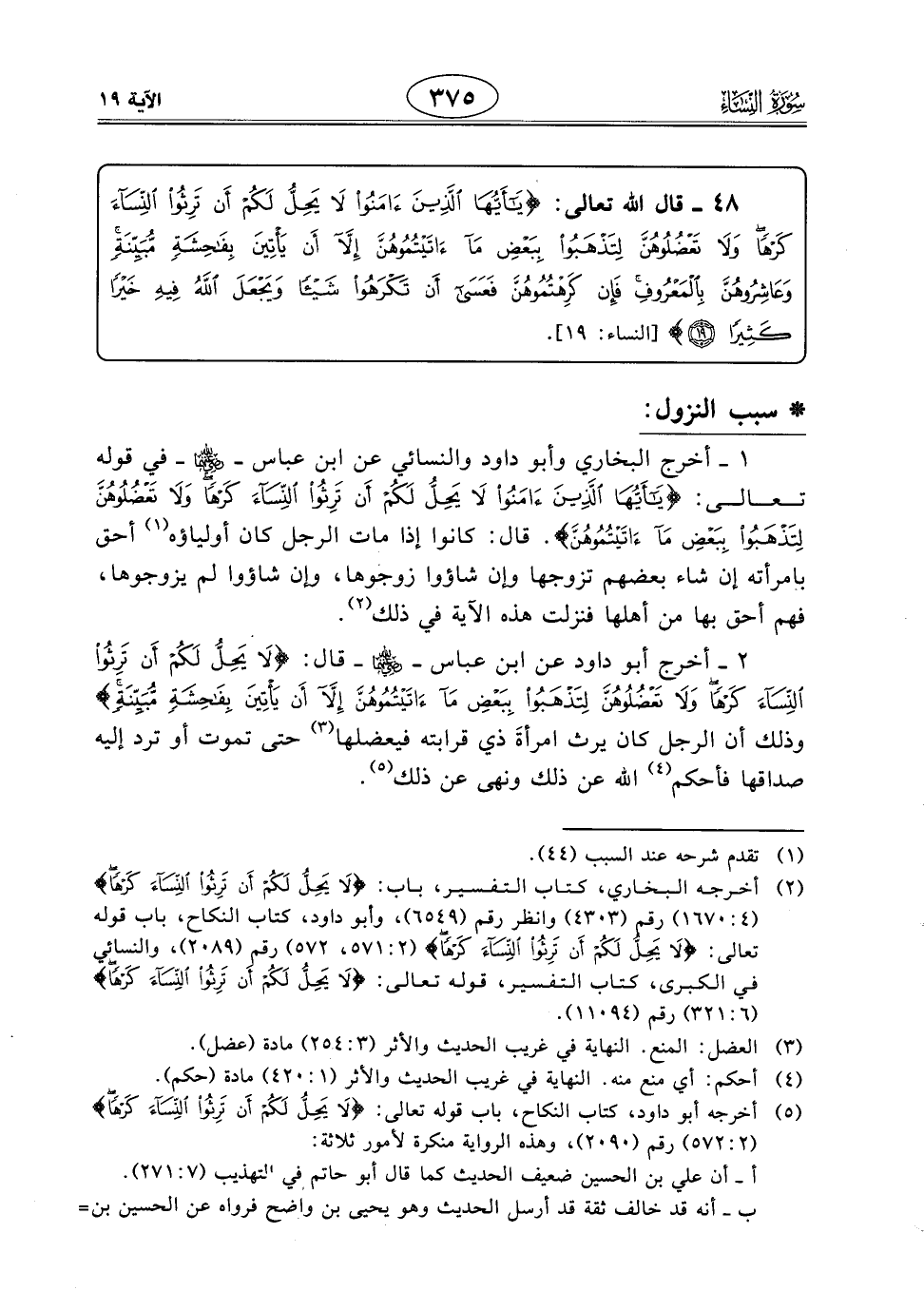 2 - أخرج أبو داود عن ابن عبَّاسٍ - رَضِيَ اللَّهُ عَنْهُمَا - قال: لَا يَحِلُّ لَكُمْ أَنْ تَرِثُوا النِّسَاءَ كَرْهًا وَلَا تَعْضُلُوهُنَّ لِتَذْهَبُوا بِبَعْضِ مَا آتَيْتُمُوهُنَّ إِلَّا أَنْ يَأْتِينَ بِفَاحِشَةٍ مُبَيِّنَةٍ) وذلك أن الرجل كان يرث امرأةَ ذي قرابته فيعضلها حتى تموت أو ترد إليه صداقها فأحكم الله عن ذلك ونهى عن ذلك.