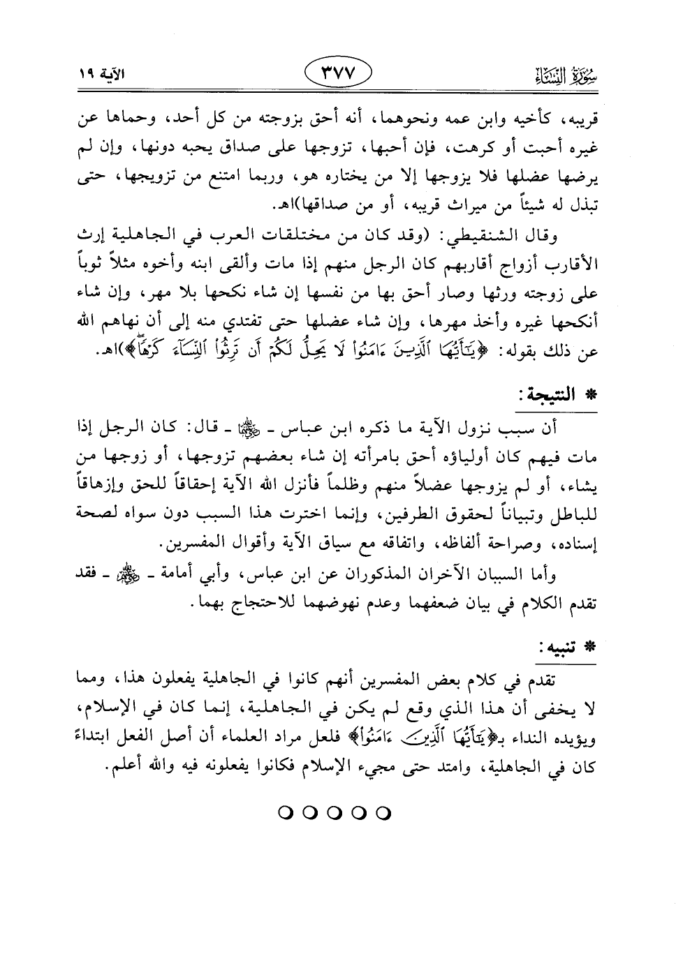 وقال الشنقيطي: (وقد كان من مختلقات العرب في الجاهلية إرث الأقارب أزواج أقاربهم كان الرجل منهم إذا مات وألقى ابنه وأخوه مثلاً ثوباً على زوجته ورثها وصار أحق بها من نفسها إن شاء نكحها بلا مهر، وإن شاء أنكحها غيره وأخذ مهرها، وإن شاء عضلها حتى تفتدي منه إلى أن نهاهم اللَّه عن ذلك بقوله: (يَا أَيُّهَا الَّذِينَ آمَنُوا لَا يَحِلُّ لَكُمْ أَنْ تَرِثُوا النِّسَاءَ كَرْهًا). اهـ.