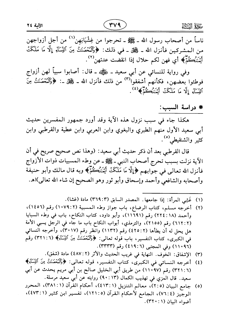 قال القرطبي بعد أن ذكر حديث أبي سعيد: (وهذا نص صحيح صريح في أن الآية نزلت بسبب تحرج أصحاب النبي - صَلَّى اللَّهُ عَلَيْهِ وَسَلَّمَ - عن وطء المسبيات ذوات الأزواج فأنزل اللَّه تعالى في جوابهم (إِلَّا مَا مَلَكَتْ أَيْمَانُكُمْ) وبه قال مالك وأبو حنيفة وأصحابه والشافعي وأحمد وإسحاق وأبو ثور وهو الصحيح إن شاء اللَّه تعالى). اهـ.