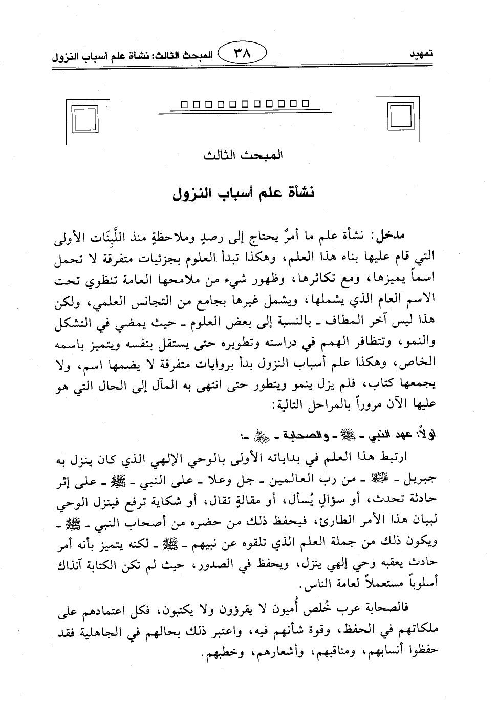 مدخل: نشأة علم ما أمرٌ يحتاج إلى رصدٍ وملاحظةٍ منذ اللَّبِنَات الأولى التي قام عليها بناء هذا العلم، وهكذا تبدا العلوم بجزئيات متفرقة لا تحمل اسماً يميزها، ومع تكاثرها، وظهور شيء من ملامحها العامة تنطوي تحت الاسم العام الذي يشملها، ويشمل غيرها بجامع من التجانس العلمي، ولكن هذا ليس آخر المطاف - بالنسبة إلى بعض العلوم - حيث يمضي في التشكل والنمو، وتتظافر الهمم في دراسته وتطويره حتى يستقل بنفسه ويتميز باسمه الخاص، وهكذا علم أسباب النزول بدأ بروايات متفرقة لا يضمها اسم، ولا يجمعها كتاب، فلم يزل ينمو ويتطور حتى انتهى به المآل إلى الحال التي هو عليها الآن مروراً بالمراحل التالية:
