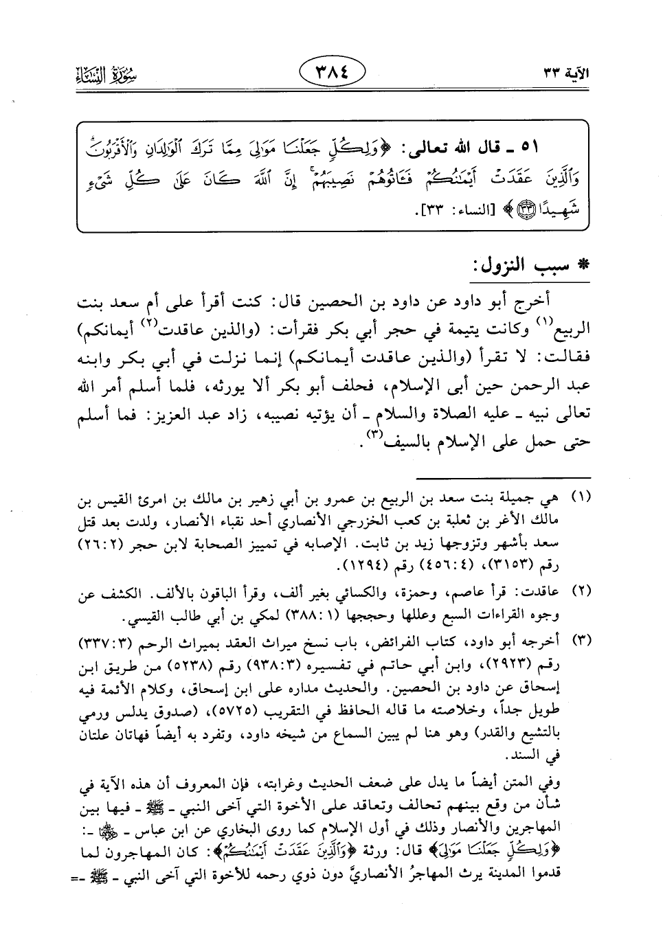 51 - قال الله تعالى: (وَلِكُلٍّ جَعَلْنَا مَوَالِيَ مِمَّا تَرَكَ الْوَالِدَانِ وَالْأَقْرَبُونَ وَالَّذِينَ عَقَدَتْ أَيْمَانُكُمْ فَآتُوهُمْ نَصِيبَهُمْ إِنَّ اللَّهَ كَانَ عَلَى كُلِّ شَيْءٍ شَهِيدًا (33)