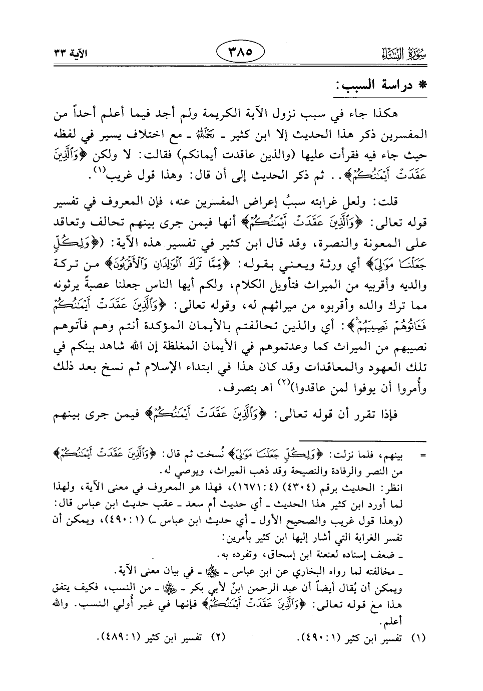 قلت: ولعل غرابته سببُ إعراض المفسرين عنه، فإن المعروف في تفسير قوله تعالى: (وَالَّذِينَ عَقَدَتْ أَيْمَانُكُمْ) أنها فيمن جرى بينهم تحالف وتعاقد على المعونة والنصرة، وقد قال ابن كثير في تفسير هذه الآية: (وَلِكُلٍّ جَعَلْنَا مَوَالِيَ) أي ورثة ويعني بقوله: (مِمَّا تَرَكَ الْوَالِدَانِ وَالْأَقْرَبُونَ) من تركة والديه وأقربيه من الميراث فتأويل الكلام، ولكم أيها الناس جعلنا عصبةً يرثونه مما ترك والده وأقربوه من ميراثهم له، وقوله تعالى: (وَالَّذِينَ عَقَدَتْ أَيْمَانُكُمْ فَآتُوهُمْ نَصِيبَهُمْ): أي والذين تحالفتم بالأيمان المؤكدة أنتم وهم فآتوهم نصيبهم من الميراث كما وعدتموهم في الأيمان المغلظة إن اللَّه شاهد بينكم في تلك العهود والمعاقدات وقد كان هذا في ابتداء الإسلام ثم نسخ بعد ذلك وأُمروا أن يوفوا لمن عاقدوا) اهـ بتصرف.