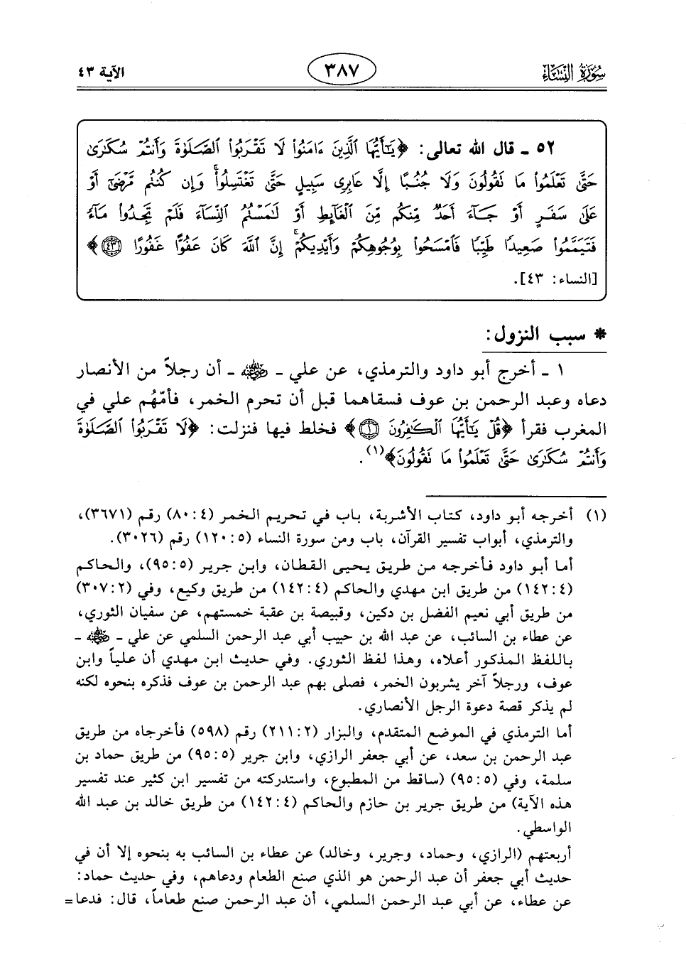 52 - قال الله تعالى: (يَا أَيُّهَا الَّذِينَ آمَنُوا لَا تَقْرَبُوا الصَّلَاةَ وَأَنْتُمْ سُكَارَى حَتَّى تَعْلَمُوا مَا تَقُولُونَ وَلَا جُنُبًا إِلَّا عَابِرِي سَبِيلٍ حَتَّى تَغْتَسِلُوا وَإِنْ كُنْتُمْ مَرْضَى أَوْ عَلَى سَفَرٍ أَوْ جَاءَ أَحَدٌ مِنْكُمْ مِنَ الْغَائِطِ أَوْ لَامَسْتُمُ النِّسَاءَ فَلَمْ تَجِدُوا مَاءً فَتَيَمَّمُوا صَعِيدًا طَيِّبًا فَامْسَحُوا بِوُجُوهِكُمْ وَأَيْدِيكُمْ إِنَّ اللَّهَ كَانَ عَفُوًّا غَفُورًا (43)