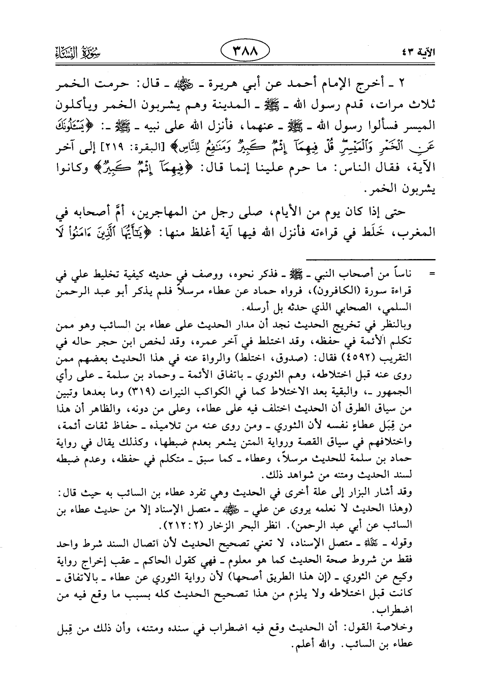 2 - أخرج الإمام أحمد عن أبي هريرة - رَضِيَ اللَّهُ عَنْهُ - قال: حرمت الخمر ثلاث مرات، قدم رسول اللَّه - صَلَّى اللَّهُ عَلَيْهِ وَسَلَّمَ - المدينة وهم يشربون الخمر ويأكلون الميسر فسألوا رسول الله - صَلَّى اللَّهُ عَلَيْهِ وَسَلَّمَ - عنهما، فأنزل الله على نبيه - صَلَّى اللَّهُ عَلَيْهِ وَسَلَّمَ -: (يَسْأَلُونَكَ عَنِ الْخَمْرِ وَالْمَيْسِرِ قُلْ فِيهِمَا إِثْمٌ كَبِيرٌ وَمَنَافِعُ لِلنَّاسِ)، إلى آخر الآية، فقال الناس: ما حرم علينا إنما قال: (فِيهِمَا إِثْمٌ كَبِيرٌ) وكانوا يشربون الخمر.