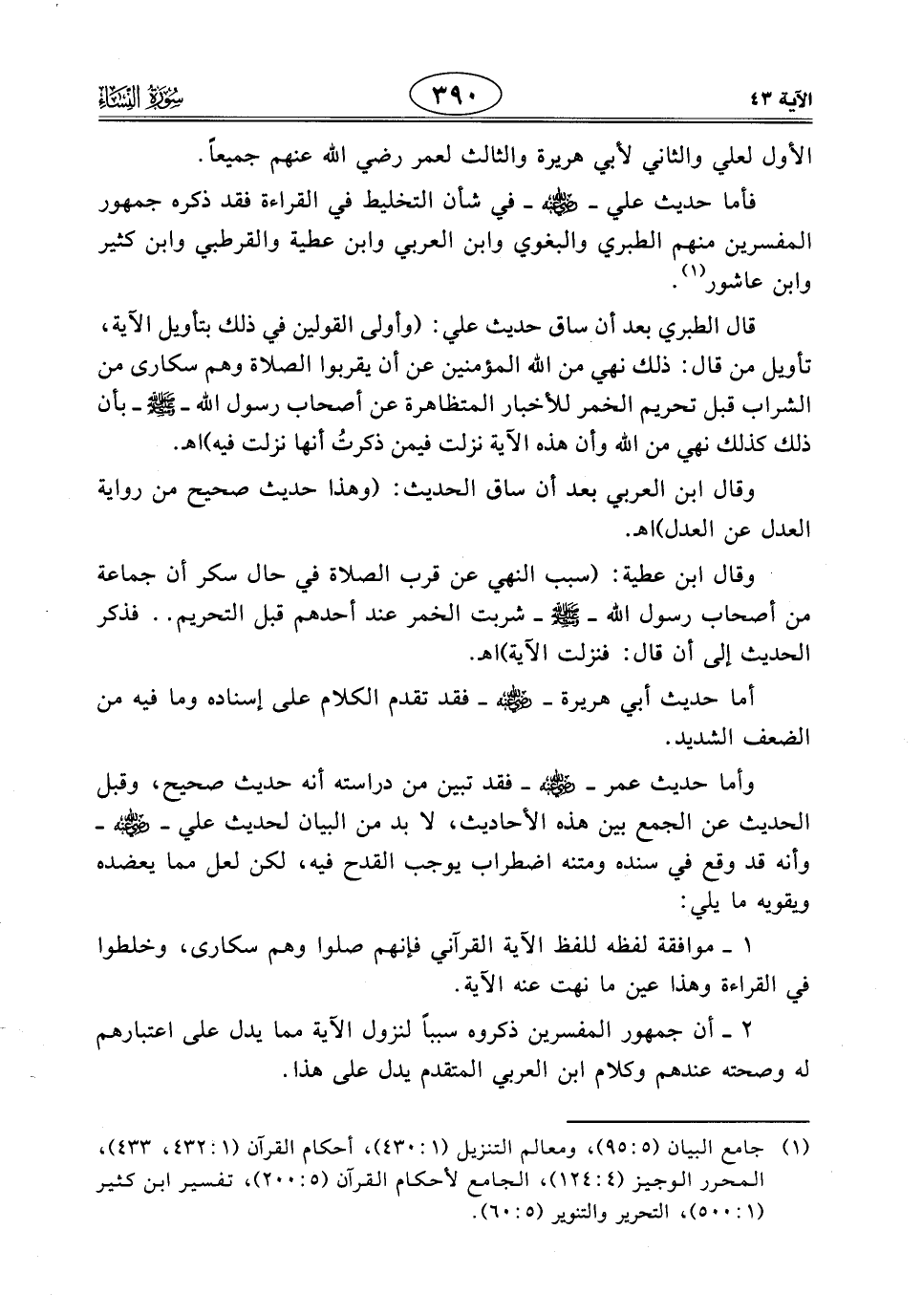 قال الطبري بعد أن ساق حديث علي: (وأولى القولين في ذلك بتأويل الآية، تأويل من قال: ذلك نهي من الله المؤمنين عن أن يقربوا الصلاة وهم سكارى من الشراب قبل تحريم الخمر للأخبار المتظاهرة عن أصحاب رسول الله - صَلَّى اللَّهُ عَلَيْهِ وَسَلَّمَ - بأن ذلك كذلك نهي من الله وأن هذه الآية نزلت فيمن ذكرتُ أنها نزلت فيه) اهـ.