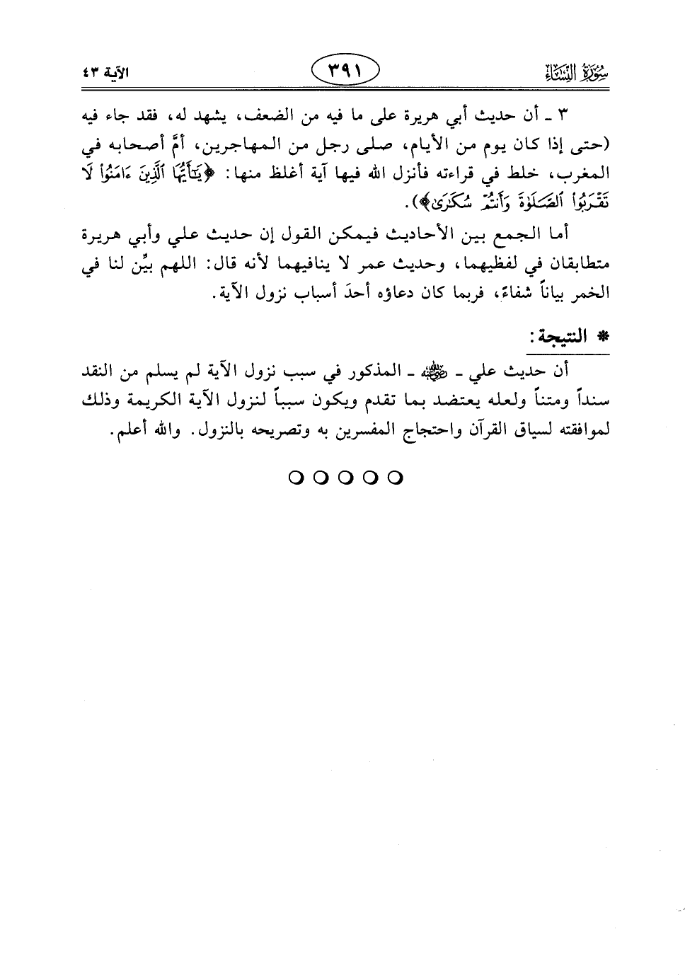 3 - أن حديث أبي هريرة على ما فيه من الضعف، يشهد له، فقد جاء فيه (حتى إذا كان يوم من الأيام، صلى رجل من المهاجرين، أمَّ أصحابه في المغرب، خلط في قراءته فأنزل الله فيها آية أغلظ منها: (يَا أَيُّهَا الَّذِينَ آمَنُوا لَا تَقْرَبُوا الصَّلَاةَ وَأَنْتُمْ سُكَارَى).