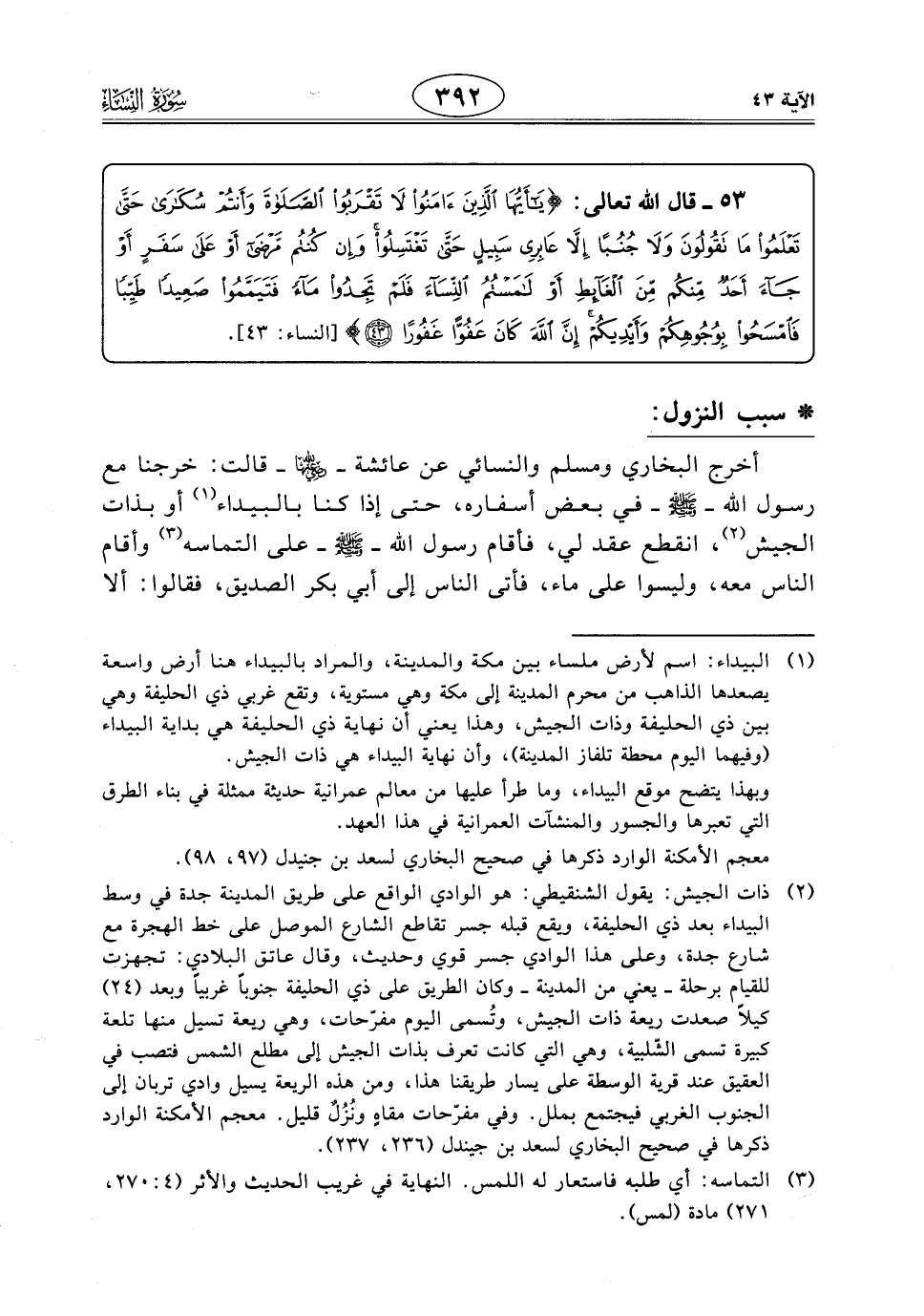 53 - قال الله تعالى: (يَا أَيُّهَا الَّذِينَ آمَنُوا لَا تَقْرَبُوا الصَّلَاةَ وَأَنْتُمْ سُكَارَى حَتَّى تَعْلَمُوا مَا تَقُولُونَ وَلَا جُنُبًا إِلَّا عَابِرِي سَبِيلٍ حَتَّى تَغْتَسِلُوا وَإِنْ كُنْتُمْ مَرْضَى أَوْ عَلَى سَفَرٍ أَوْ جَاءَ أَحَدٌ مِنْكُمْ مِنَ الْغَائِطِ أَوْ لَامَسْتُمُ النِّسَاءَ فَلَمْ تَجِدُوا مَاءً فَتَيَمَّمُوا صَعِيدًا طَيِّبًا فَامْسَحُوا بِوُجُوهِكُمْ وَأَيْدِيكُمْ إِنَّ اللَّهَ كَانَ عَفُوًّا غَفُورًا (43)