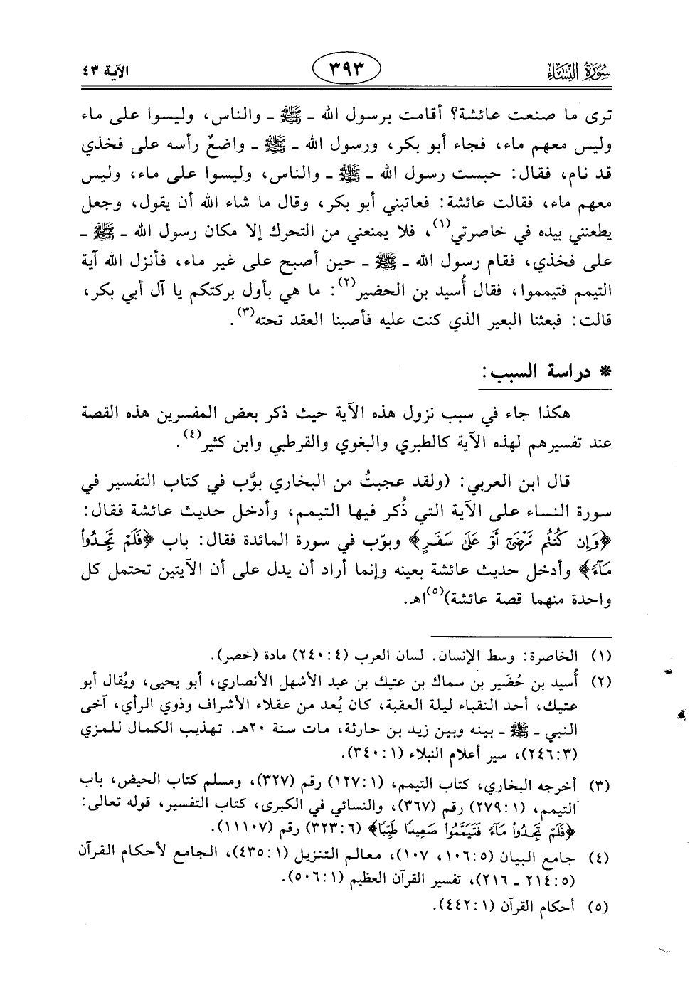 قال ابن العربي: (ولقد عجبتُ من البخاري بوَّب في كتاب التفسير في سورة النساء على الآية التي ذُكر فيها التيمم، وأدخل حديث عائشة فقال: (وَإِنْ كُنْتُمْ مَرْضَى أَوْ عَلَى سَفَرٍ) وبوّب في سورة المائدة فقال: باب (فَلَمْ تَجِدُوا مَاءً) وأدخل حديث عائشة بعينه وإنما أراد أن يدل على أن الآيتين تحتمل كل واحدة منهما قصة عائشة) اهـ.