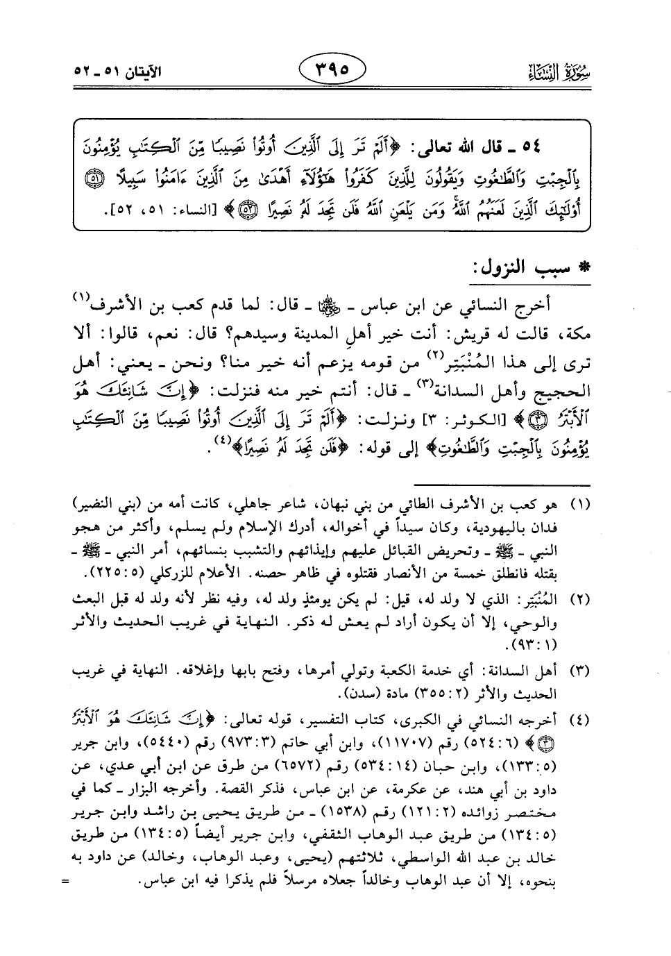 أخرج النَّسَائِي عن ابن عبَّاسٍ - رَضِيَ اللَّهُ عَنْهُمَا - قال: لما قدم كعب بن الأشرف مكة، قالت له قريش: أنت خير أهلِ المدينة وسيدهم؟ قال: نعم، قالوا: ألا ترى إلى هذا المُنْبَتِر من قومه يزعم أنه خير منا؟ ونحن - يعني: أهل الحجيج وأهل السدانة - قال: أنتم خير منه فنزلت: (إِنَّ شَانِئَكَ هُوَ الْأَبْتَرُ) ونزلت: (أَلَمْ تَرَ إِلَى الَّذِينَ أُوتُوا نَصِيبًا مِنَ الْكِتَابِ يُؤْمِنُونَ بِالْجِبْتِ وَالطَّاغُوتِ) إلى قوله: (فَلَنْ تَجِدَ لَهُ نَصِيرًا).