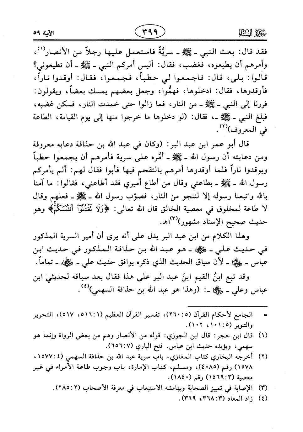 وهذا الكلام من ابن عبد البر يدل على أنه يرى أن أمير السرية المذكور في حديث علي - رَضِيَ اللَّهُ عَنْهُ - هو عبد الله بن حذافة المذكور في حديث ابن عباس - رَضِيَ اللَّهُ عَنْهُمَا - لأن سياق الحديث الذي ذكره يوافق حديث علي - رَضِيَ اللَّهُ عَنْهُ - تماماً.