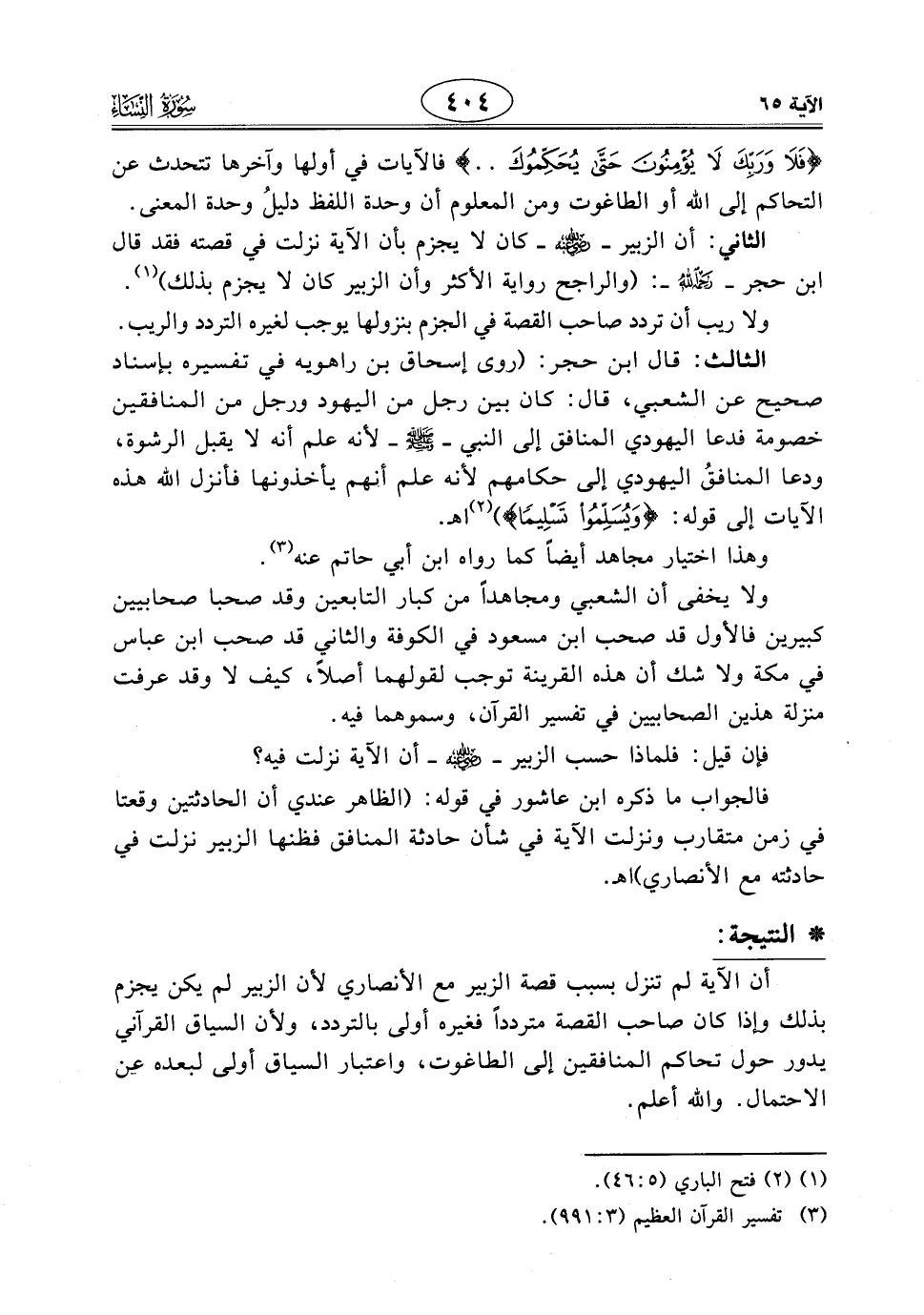 أن الآية لم تنزل بسبب قصة الزبير مع الأنصاري لأن الزبير لم يكن يجزم بذلك وإذا كان صاحب القصة مترددا فغيره أولى بالتردد، ولأن السياق القرآني يدور حول تحاكم المنافقين إلى الطاغوت، واعتبار السياق أولى لبعده عن الاحتمال. والله أعلم.