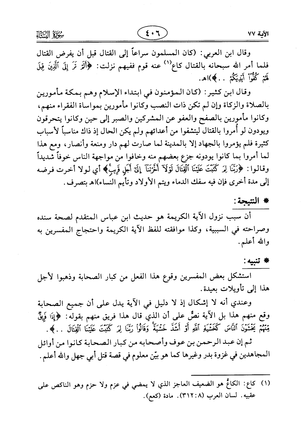 وقال ابن العربي: (كان المسلمون سراعاً إلى القتال قبل أن يفرض القتال فلما أمر الله سبحانه بالقتال كاع عنه قوم ففيهم نزلت: (أَلَمْ تَرَ إِلَى الَّذِينَ قِيلَ لَهُمْ كُفُّوا أَيْدِيَكُمْ) اهـ.