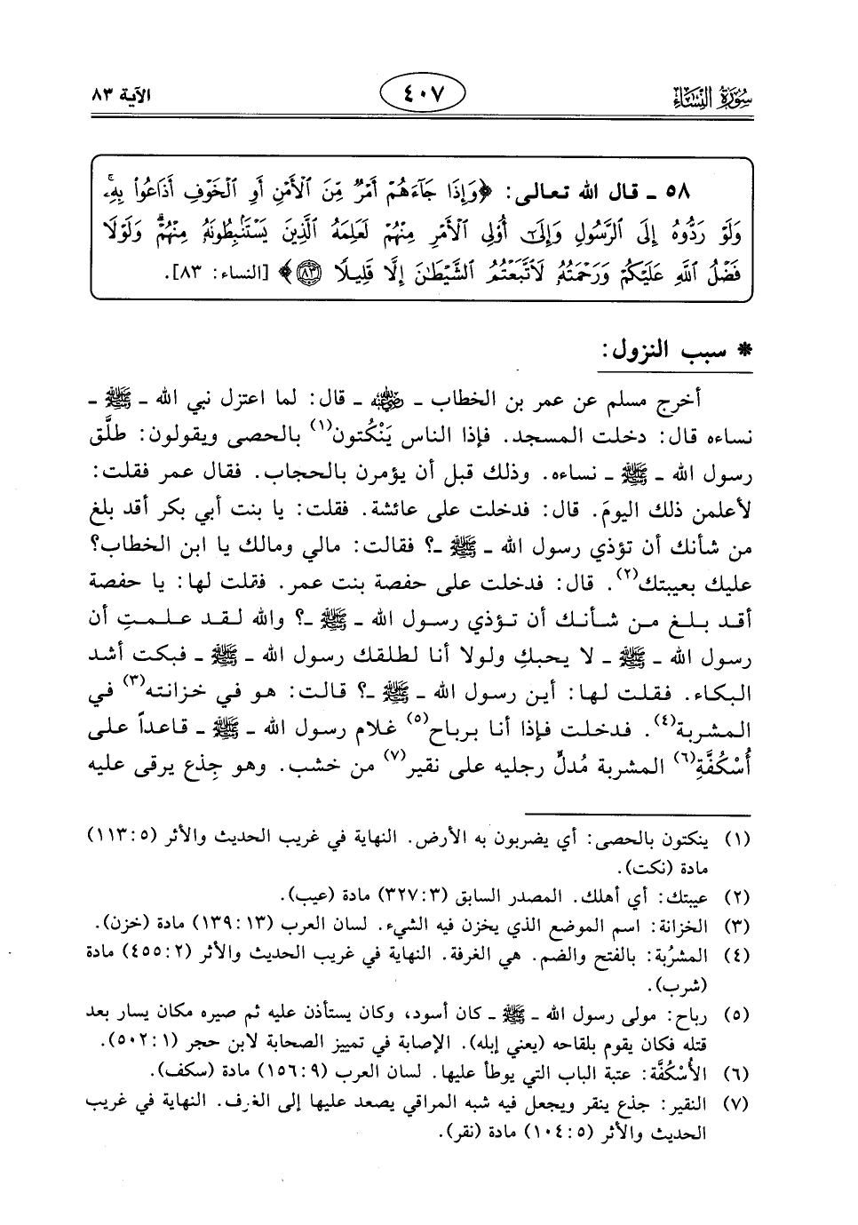 أخرج مسلم عن عمر بن الخطاب - رَضِيَ اللَّهُ عَنْهُ - قال: لما اعتزل نبي الله - صَلَّى اللَّهُ عَلَيْهِ وَسَلَّمَ - نساءه قال: دخلت المسجد. فإذا الناس يَنْكُتون بالحصى ويقولون: طلَّق رسول اللَّه - صَلَّى اللَّهُ عَلَيْهِ وَسَلَّمَ - نساءه. وذلك قبل أن يؤمرن بالحجاب. فقال عمر فقلت: لأعلمن ذلك اليومَ. قال: فدخلت على عائشة. فقلت: يا بنت أبي بكر أقد بلغ من شأنك أن تؤذي رسول الله - صَلَّى اللَّهُ عَلَيْهِ وَسَلَّمَ -؟ فقالت: ما لي وما لك يا ابن الخطاب؟ عليك بعيبتك. قال: فدخلت على حفصة بنت عمر. وقلت لها: يا حفصة أقد بلغ من شأنك أن تؤذي رسول اللَّه - صَلَّى اللَّهُ عَلَيْهِ وَسَلَّمَ -؟ واللَّه لقد علمتِ أن رسول اللَّه - صَلَّى اللَّهُ عَلَيْهِ وَسَلَّمَ - لا يحبكِ ولولا أنا لطلقك رسول الله - صَلَّى اللَّهُ عَلَيْهِ وَسَلَّمَ - فبكت أشد البكاء. فقلت لها: أين رسول اللَّه - صَلَّى اللَّهُ عَلَيْهِ وَسَلَّمَ -؟ قالت: هو في خزانته في المشربة. فدخلت فإذا أنا برباح غلام رسول اللَّه - صَلَّى اللَّهُ عَلَيْهِ وَسَلَّمَ - قاعدًا على أُسْكُفَّةِ المشربة مُدلِّ رجليه على نقير من خشب. وهو جِذع يرقى عليه