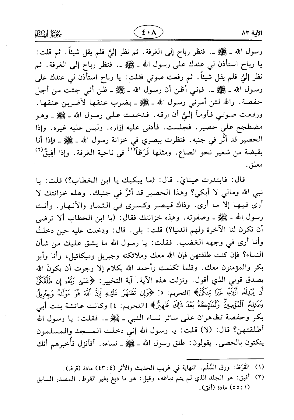 رسول اللَّه - صَلَّى اللَّهُ عَلَيْهِ وَسَلَّمَ -. فنظر رباح إلى الغرفة. ثم نظر إليَّ فلم يقل شيئاً. ثم قلت: يا رباح استأذن لي عندك على رسول اللَّه - صَلَّى اللَّهُ عَلَيْهِ وَسَلَّمَ -. فنظر رباح إلى الغرفة. ثم نظر إليَّ فلم يقل شيئاً. ثم رفعت صوتي فقلت: يا رباح استأذن لي عندك على رسول اللَّه - صَلَّى اللَّهُ عَلَيْهِ وَسَلَّمَ -. فإني أظن أن رسول اللَّه - صَلَّى اللَّهُ عَلَيْهِ وَسَلَّمَ - ظن أني جئت من أجل حفصة. والله لئن أمرني رسول الله - صَلَّى اللَّهُ عَلَيْهِ وَسَلَّمَ - بضرب عنقها لأضربن عنقها. ورفعت صوتي فأومأ إليَّ أن ارقه. فدخلت على رسول اللَّه - صَلَّى اللَّهُ عَلَيْهِ وَسَلَّمَ - وهو مضطجع على حصير. فجلست. فأدنى عليه إزاره. وليس عليه غيره. وإذا الحصير قد أثَّر في جنبه. فنظرت ببصري في خزانة رسول اللَّه - صَلَّى اللَّهُ عَلَيْهِ وَسَلَّمَ - فإذا أنا بقبضة من شعير نحو الصاع. ومثلها قَرَظاً في ناحية الغرفة. وإذا أفِيقٌ معلق.