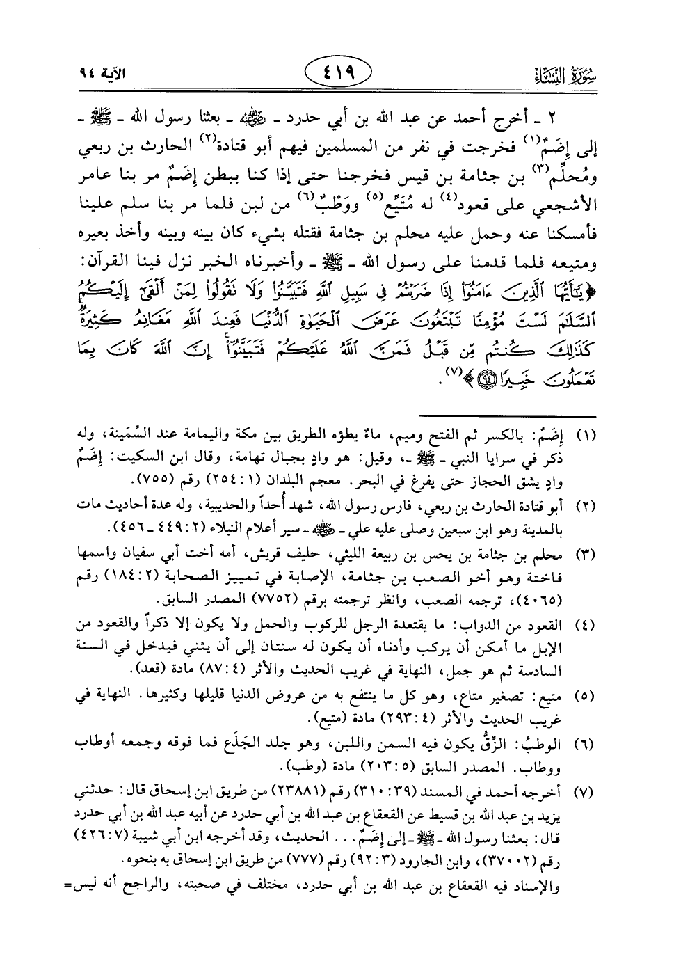 2 - أخرج أحمد عن عبد اللَّه بن أبي حدرد - رَضِيَ اللَّهُ عَنْهُ - بعثنا رسول الله - صَلَّى اللَّهُ عَلَيْهِ وَسَلَّمَ - إلى إِضَمٌ فخرجت في نفر من المسلمين فيهم أبو قتادة الحارث بن ربعي ومُحلِّم بن جثامة بن قيس فخرجنا حتى إذا كنا ببطن إِضَمٌ مر بنا عامر الأشجعي على قعود له مُتَيِّع ووَطْبٌ من لبن فلما مر بنا سلم علينا فأمسكنا عنه وحمل عليه محلم بن جثامة فقتله بشيء كان بينه وبينه وأخذ بعيره ومتيعه فلما قدمنا على رسول الله - صَلَّى اللَّهُ عَلَيْهِ وَسَلَّمَ - وأخبرناه الخبر نزل فينا القرآن: (يَا أَيُّهَا الَّذِينَ آمَنُوا إِذَا ضَرَبْتُمْ فِي سَبِيلِ اللَّهِ فَتَبَيَّنُوا وَلَا تَقُولُوا لِمَنْ أَلْقَى إِلَيْكُمُ السَّلَامَ لَسْتَ مُؤْمِنًا تَبْتَغُونَ عَرَضَ الْحَيَاةِ الدُّنْيَا فَعِنْدَ اللَّهِ مَغَانِمُ كَثِيرَةٌ كَذَلِكَ كُنْتُمْ مِنْ قَبْلُ فَمَنَّ اللَّهُ عَلَيْكُمْ فَتَبَيَّنُوا إِنَّ اللَّهَ كَانَ بِمَا تَعْمَلُونَ خَبِيرًا).