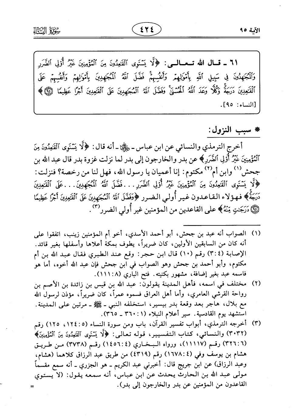 أخرج الترمذي والنَّسَائِي عن ابن عبَّاسٍ - رَضِيَ اللَّهُ عَنْهُمَا - أنه قال: (لَا يَسْتَوِي الْقَاعِدُونَ مِنَ الْمُؤْمِنِينَ غَيْرُ أُولِي الضَّرَرِ) عن بدر والخارجون إلى بدر لما نزلت غزوة بدر قال عبد الله بن جحش وابن أم مكتوم: إنا أعميان يا رسول اللَّه، فهل لنا من رخصة؟ فنزلت: (لَا يَسْتَوِي الْقَاعِدُونَ مِنَ الْمُؤْمِنِينَ غَيْرُ أُولِي الضَّرَرِ ... فَضَّلَ اللَّهُ الْمُجَاهِدِينَ ... عَلَى الْقَاعِدِينَ دَرَجَةً) فهؤلاء القاعدون غير أُولي الضرر (وَفَضَّلَ اللَّهُ الْمُجَاهِدِينَ عَلَى الْقَاعِدِينَ أَجْرًا عَظِيمًا دَرَجَاتٍ مِنْهُ) على القاعدين من المؤمنين غير أُولي الضرر.