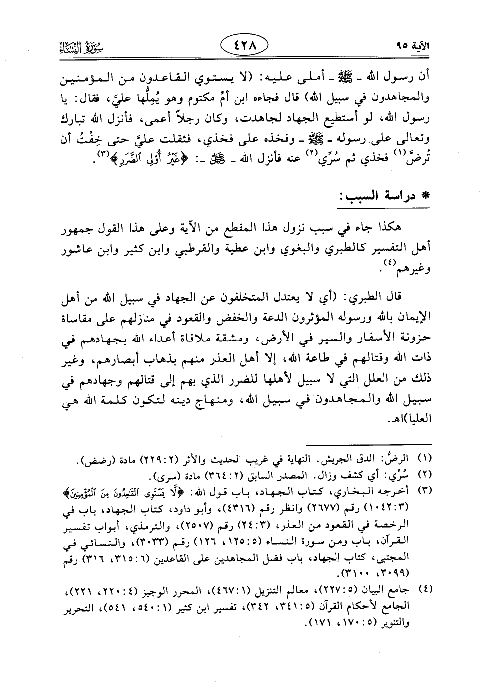 قال الطبري: (أي لا يعتدل المتخلفون عن الجهاد في سبيل اللَّه من أهل الإيمان باللَّه ورسوله المؤثرون الدعة والخفض والقعود في منازلهم على مقاساة حزونة الأسفار والسير في الأرض، ومشقة ملاقاة أعداء اللَّه بجهادهم في ذات الله وقتالهم في طاعة الله، إلا أهل العذر منهم بذهاب أبصارهم، وغير ذلك من العلل التي لا سبيل لأهلها للضرر الذي بهم إلى قتالهم وجهادهم في سبيل الله والمجاهدون في سبيل الله، ومنهاج دينه لتكون كلمة الله هي العليا) اهـ.