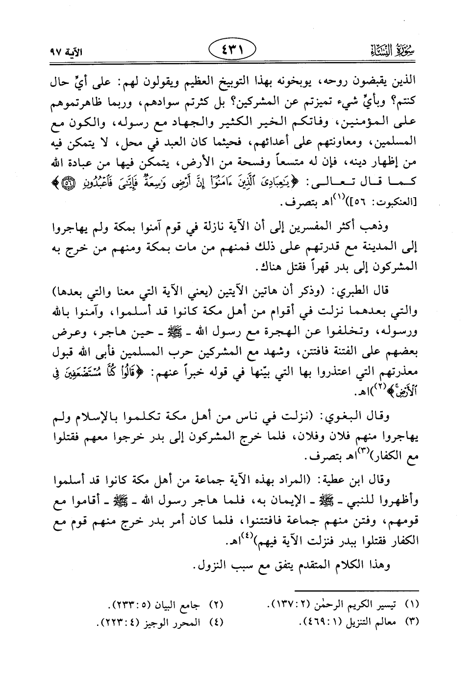 وقال البغوي: (نزلت في ناس من أهل مكة تكلموا بالإسلام ولم يهاجروا منهم فلان وفلان، فلما خرج المشركون إلى بدر خرجوا معهم فقتلوا مع الكفار) اهـ بتصرف.
