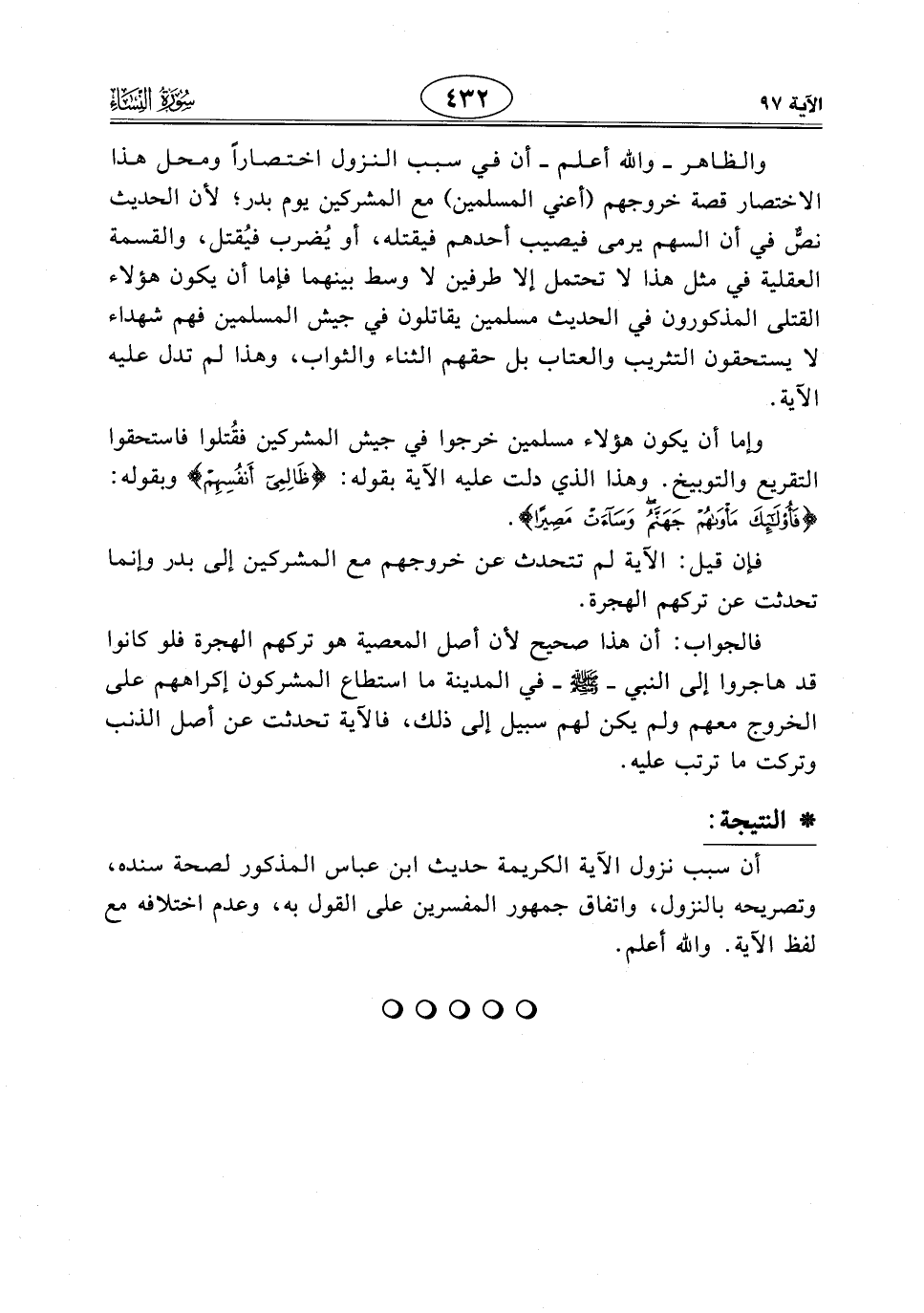 والظاهر - والله أعلم - أن في سبب النزول اختصارًا ومحل هذا الاختصار قصة خروجهم (أعني المسلمين) مع المشركين يوم بدرة لأن الحديث نص في أن السهم يرمى فيصيب أحدهم فيقتله، أو يُضرب فيُقتل، والقسمة العقلية في مثل هذا لا تحتمل إلا طرفين لا وسط بينهما فإما أن يكون هؤلاء القتلى المذكورون في الحديث مسلمين يقاتلون في جيش المسلمين فهم شهداء لا يستحقون التثريب والعتاب بل حقهم الثناء والثواب، وهذا لم تدل عليه الآية.