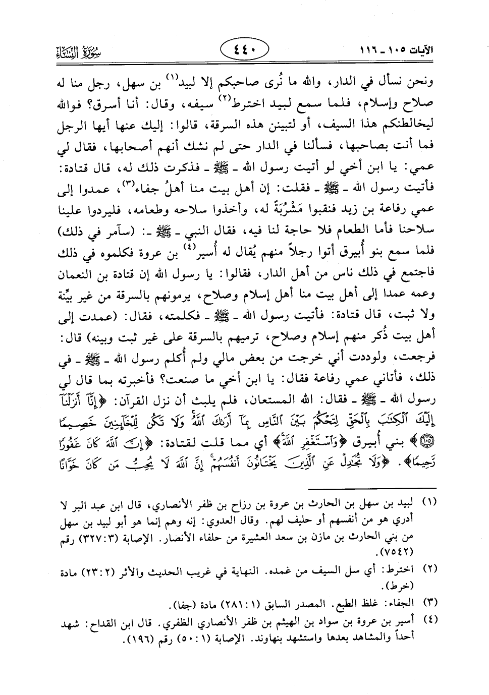 ونحن نسأل في الدار، والله ما نُرى صاحبكم إلا لبيد بن سهل، رجل منا له صلاح وإسلام، فلما سمع لبيد اخترط سيفه، وقال: أنا أسرق؟ فواللَّه ليخالطنكم هذا السيف، أو لتبينن هذه السرقة، قالوا: إليك عنها أيها الرجل فما أنت بصاحبها، فسألنا في الدار حتى لم نشك أنهم أصحابها، فقال لي عمي: يا ابن أخي لو أتيت رسول الله - صَلَّى اللَّهُ عَلَيْهِ وَسَلَّمَ - فذكرت ذلك له، قال قتادة: فأتيت رسول اللَّه - صَلَّى اللَّهُ عَلَيْهِ وَسَلَّمَ - فقلت: إن أهل بيت منا أهلُ جفاء، عمدوا إلى عمي رفاعة بن زيد فنقبوا مَشْرُبَةً له، وأخذوا سلاحه وطعامه، فليردوا علينا سلاحنا فأما الطعام فلا حاجة لنا فيه، فقال النبي - صَلَّى اللَّهُ عَلَيْهِ وَسَلَّمَ -: (سآمر في ذلك) فلما سمع بنو أُبيرق أتوا رجلاً منهم يُقال له أُسير بن عروة فكلموه في ذلك فاجتمع في ذلك ناس من أهل الدار، فقالوا: يا رسول اللَّه إن قتادة بن النعمان وعمه عمدا إلى أهل بيت منا أهل إسلام وصلاح، يرمونهم بالسرقة من غير بيِّنة ولا ثبت، قال قتادة: فأتيت رسول اللَّه - صَلَّى اللَّهُ عَلَيْهِ وَسَلَّمَ - فكلمته، فقال: (عمدت إلى أهل بيت ذُكر منهم إسلام وصلاح، ترميهم بالسرقة على غير ثبت وبينه) قال: فرجعت، ولوددت أني خرجت من بعض مالي ولم أُكلم رسول اللَّه - صَلَّى اللَّهُ عَلَيْهِ وَسَلَّمَ - في ذلك، فأتاني عمي رفاعة فقال: يا ابن أخي ما صنعت؟ فأخبرته بما قال لي رسول اللَّه - صَلَّى اللَّهُ عَلَيْهِ وَسَلَّمَ - فقال: الله المستعان، فلم يلبث أن نزل القرآن: (إِنَّا أَنْزَلْنَا إِلَيْكَ الْكِتَابَ بِالْحَقِّ لِتَحْكُمَ بَيْنَ النَّاسِ بِمَا أَرَاكَ اللَّهُ وَلَا تَكُنْ لِلْخَائِنِينَ خَصِيمًا) بني أُبيرق (وَاسْتَغْفِرِ اللَّهَ) أي مما قلت لقتادة: (إِنَّ اللَّهَ كَانَ غَفُورًا رَحِيمًا). (وَلَا تُجَادِلْ عَنِ الَّذِينَ يَخْتَانُونَ أَنْفُسَهُمْ إِنَّ اللَّهَ لَا يُحِبُّ مَنْ كَانَ خَوَّانًا