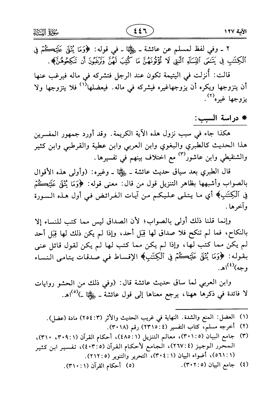 2 - وفي لفظ لمسلم عن عائشة - رضي الله عنها - في قوله: (وَمَا يُتْلَى عَلَيْكُمْ فِي الْكِتَابِ فِي يَتَامَى النِّسَاءِ اللَّاتِي لَا تُؤْتُونَهُنَّ مَا كُتِبَ لَهُنَّ وَتَرْغَبُونَ أَنْ تَنْكِحُوهُنَّ).