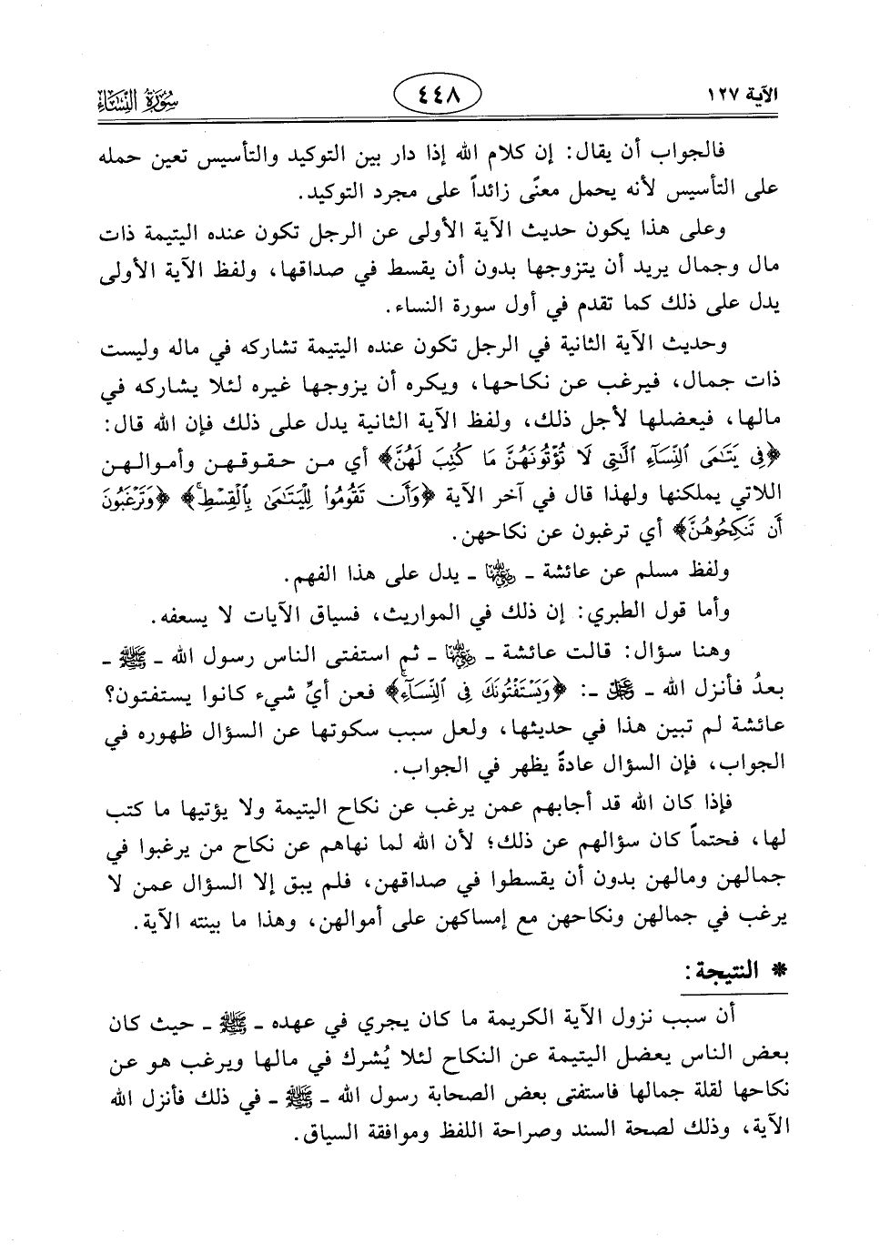 أن سبب نزول الآية الكريمة ما كان يجري في عهده - صَلَّى اللَّهُ عَلَيْهِ وَسَلَّمَ - حيث كان بعض الناس يعضل اليتيمة عن النكاح لئلا يُشرك في مالها ويرغب هو عن نكاحها لقلة جمالها فاستفتى بعض الصحابة رسول الله - صَلَّى اللَّهُ عَلَيْهِ وَسَلَّمَ - في ذلك فأنزل اللَّه الآية، وذلك لصحة السند وصراحة اللفظ وموافقة السياق.