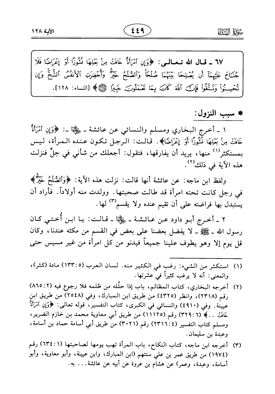 1 - أخرج البخاري ومسلم والنَّسَائِي عن عائشة - رضي الله عنها -: (وَإِنِ امْرَأَةٌ خَافَتْ مِنْ بَعْلِهَا نُشُوزًا أَوْ إِعْرَاضًا). قالت: الرجل تكون عنده المرأة، ليس بمستكثر منها، يريد أن يفارقها، فتقول: أجعلك من شأني في حِلِّ فنزلت هذه الآية في ذلك.