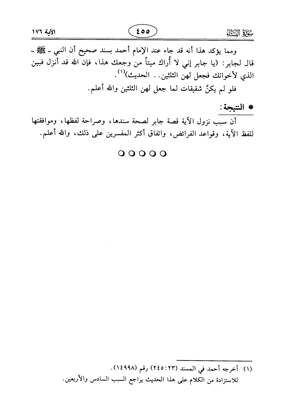 ومما يؤكد هذا أنه قد جاء عند الإمام أحمد بسند صحيح أن النبي - صَلَّى اللَّهُ عَلَيْهِ وَسَلَّمَ - قال لجابر: (يا جابر إني لا أُراك ميتًا من وجعك هذا، فإن اللَّه قد أنزل فبين الذي لأخواتك فجعل لهن الثلثين .. الحديث).