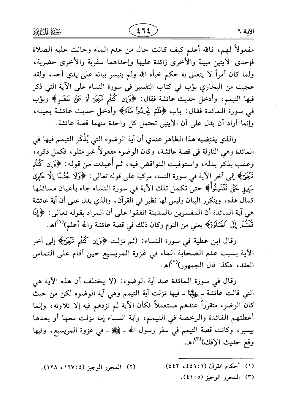 وقال في سورة المائدة عند آية الوضوء: (لا يختلف أن هذه الآية هي التي قالت عائشة - رضي الله عنها - فيها نزلت آية التيمم وهي آية الوضوء لكن من حيث كان الوضوء متقرراً عندهم مستعملاً فكأن الآية لم تزدهم فيه إلا تلاوته، وإنما أعطتهم الفائدة والرخصة في التيمم، وآية النساء إما نزلت معها أو بعدها بيسير، وكانت قصة التيمم في سفر رسول اللَّه - صَلَّى اللَّهُ عَلَيْهِ وَسَلَّمَ - في غزوة المريسيع، وفيها وقع حديث الإفك). اهـ.