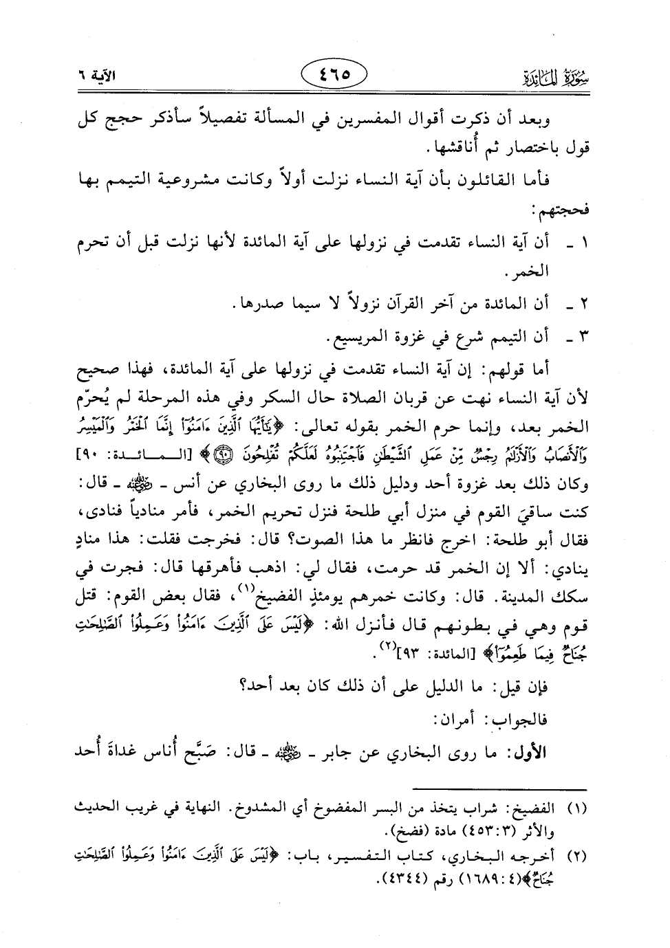 أما قولهم: إن آية النساء تقدمت في نزولها على آية المائدة، فهذا صحيح لأن آية النساء نهت عن قربان الصلاة حال السكر وفي هذه المرحلة لم يُحرّم الخمر بعد، وإنما حرم الخمر بقوله تعالى: (يَا أَيُّهَا الَّذِينَ آمَنُوا إِنَّمَا الْخَمْرُ وَالْمَيْسِرُ وَالْأَنْصَابُ وَالْأَزْلَامُ رِجْسٌ مِنْ عَمَلِ الشَّيْطَانِ فَاجْتَنِبُوهُ لَعَلَّكُمْ تُفْلِحُونَ (90)، وكان ذلك بعد غزوة أحد ودليل ذلك ما روى البخاري عن أنس - رَضِيَ اللَّهُ عَنْهُ - قال: كنت ساقيَ القوم في منزل أبي طلحة فنزل تحريم الخمر، فأمر منادياً فنادى، فقال أبو طلحة: اخرج فانظر ما هذا الصوت؟ قال: فخرجت فقلت: هذا منادٍ ينادي: ألا إن الخمر قد حرمت، فقال لي: اذهب فأهرقها قال: فجرت في سكك المدينة. قال: وكانت خمرهم يومئذٍ الفضيخ، فقال بعض القوم: قتل قوم وهي في بطونهم قال فأنزل اللَّه: (لَيْسَ عَلَى الَّذِينَ آمَنُوا وَعَمِلُوا الصَّالِحَاتِ جُنَاحٌ فِيمَا طَعِمُوا).