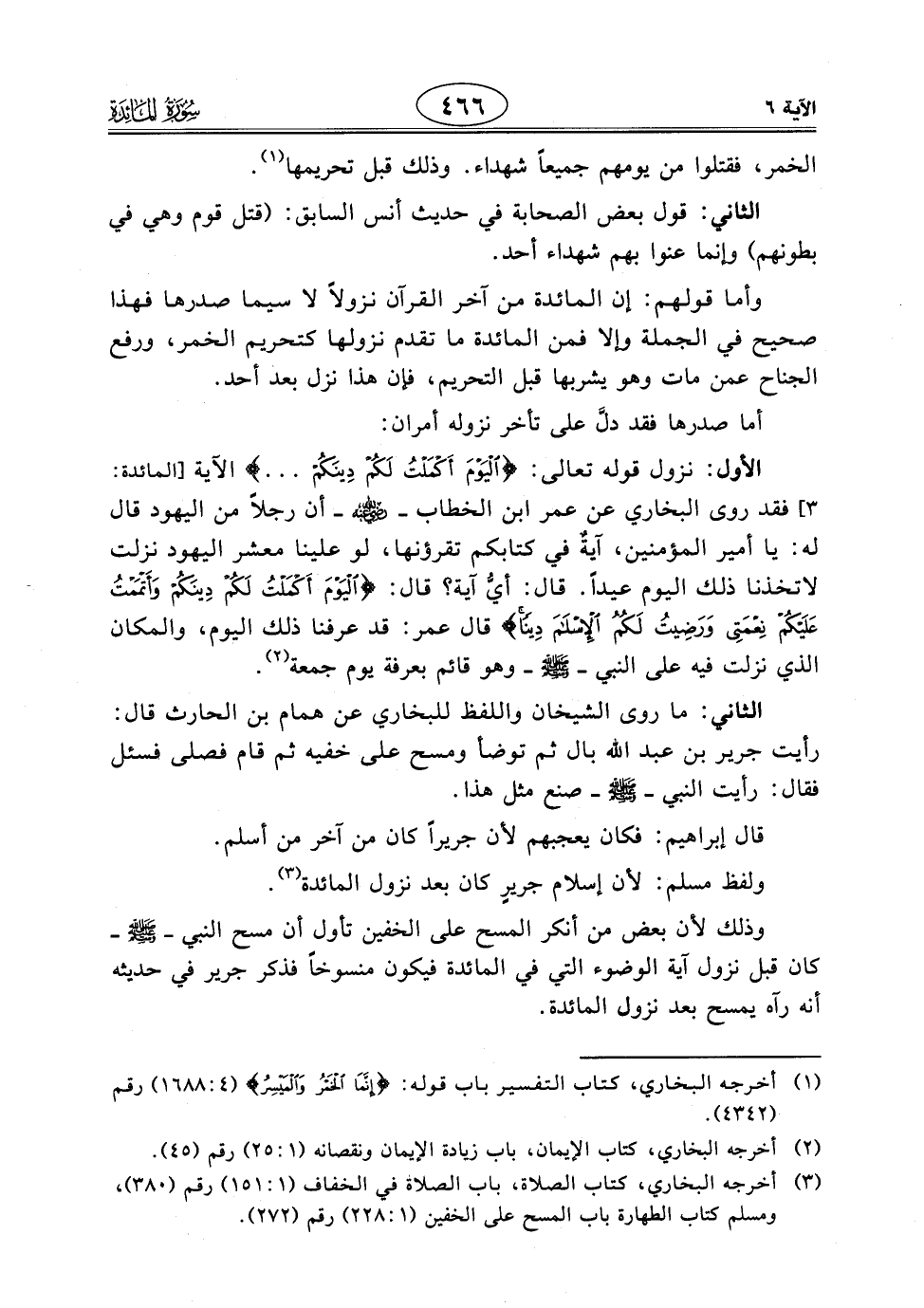 وأما قولهم: إن المائدة من آخر القرآن نزولاً لا سيما صدرها فهذا صحيح في الجملة وإلا فمن المائدة ما تقدم نزولها كتحريم الخمر، ورفع الجناح عمن مات وهو يشربها قبل التحريم، فإن هذا نزل بعد أحد.