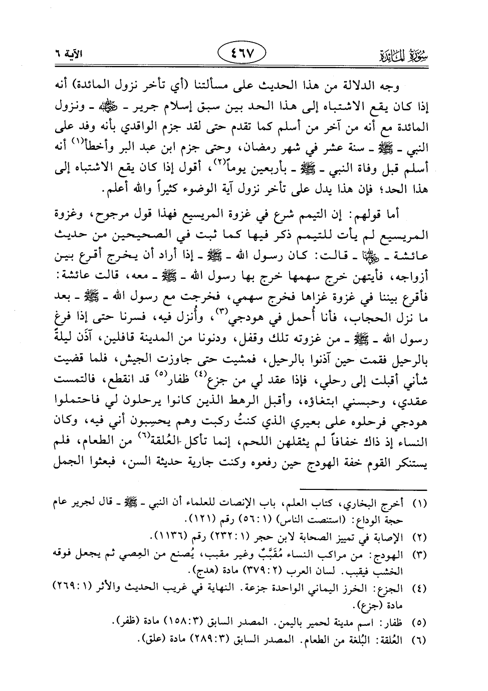 أما قولهم: إن التيمم شرع في غزوة المريسيع فهذا قول مرجوح، وغزوة المريسيع لم يأت للتيمم ذكر فيها كما ثبت في الصحيحين من حديث عائشة - رضي الله عنها - قالت: كان رسول اللَّه - صَلَّى اللَّهُ عَلَيْهِ وَسَلَّمَ - إذا أراد أن يخرج أقرع بين أزواجه، فأيتهن خرج سهمها خرج بها رسول اللَّه - صَلَّى اللَّهُ عَلَيْهِ وَسَلَّمَ - معه، قالت عائشة: فأقرع بيننا في غزوة غزاها فخرج سهمي، فخرجت مع رسول اللَّه - صَلَّى اللَّهُ عَلَيْهِ وَسَلَّمَ - بعد ما نزل الحجاب، فأنا أُحمل في هودجي، وأُنزل فيه، فسرنا حتى إذا فرغ رسول اللَّه - صَلَّى اللَّهُ عَلَيْهِ وَسَلَّمَ - من غزوته تلك وقفل، ودنونا من المدينة قافلين، آذَن ليلة بالرحيل فقمت حين آذنوا بالرحيل، فمشيت حتى جاوزت الجيش، فلما قضيت شأني أقبلت إلى رحلي، فإذا عقد لي من جزع ظفار قد انقطع، فالتمست عقدي، وحبسني ابتغاؤه، وأقبل الرهط الذين كانوا يرحلون لي فاحتملوا هودجي فرحلوه على بعيري الذي كنتُ ركبت وهم يحسِبون أني فيه، وكان النساء إذ ذاك خفافًا لم يثقلهن اللحم، إنما تأكل العُلقة من الطعام، فلم يستنكر القوم خفة الهودج حين رفعوه وكنت جارية حديثة السن، فبعثوا الجمل