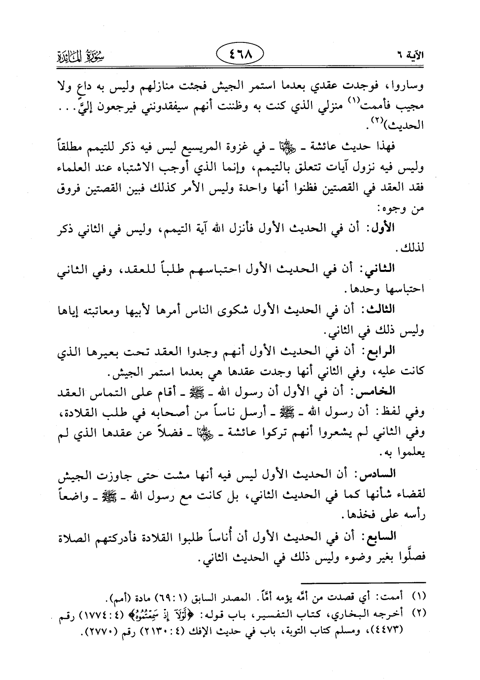 السادس: أن الحديث الأول ليس فيه أنها مشت حتى جاوزت الجيش لقضاء شأنها كما في الحديث الثاني، بل كانت مع رسول اللَّه - صَلَّى اللَّهُ عَلَيْهِ وَسَلَّمَ - واضعاً رأسه على فخذها.