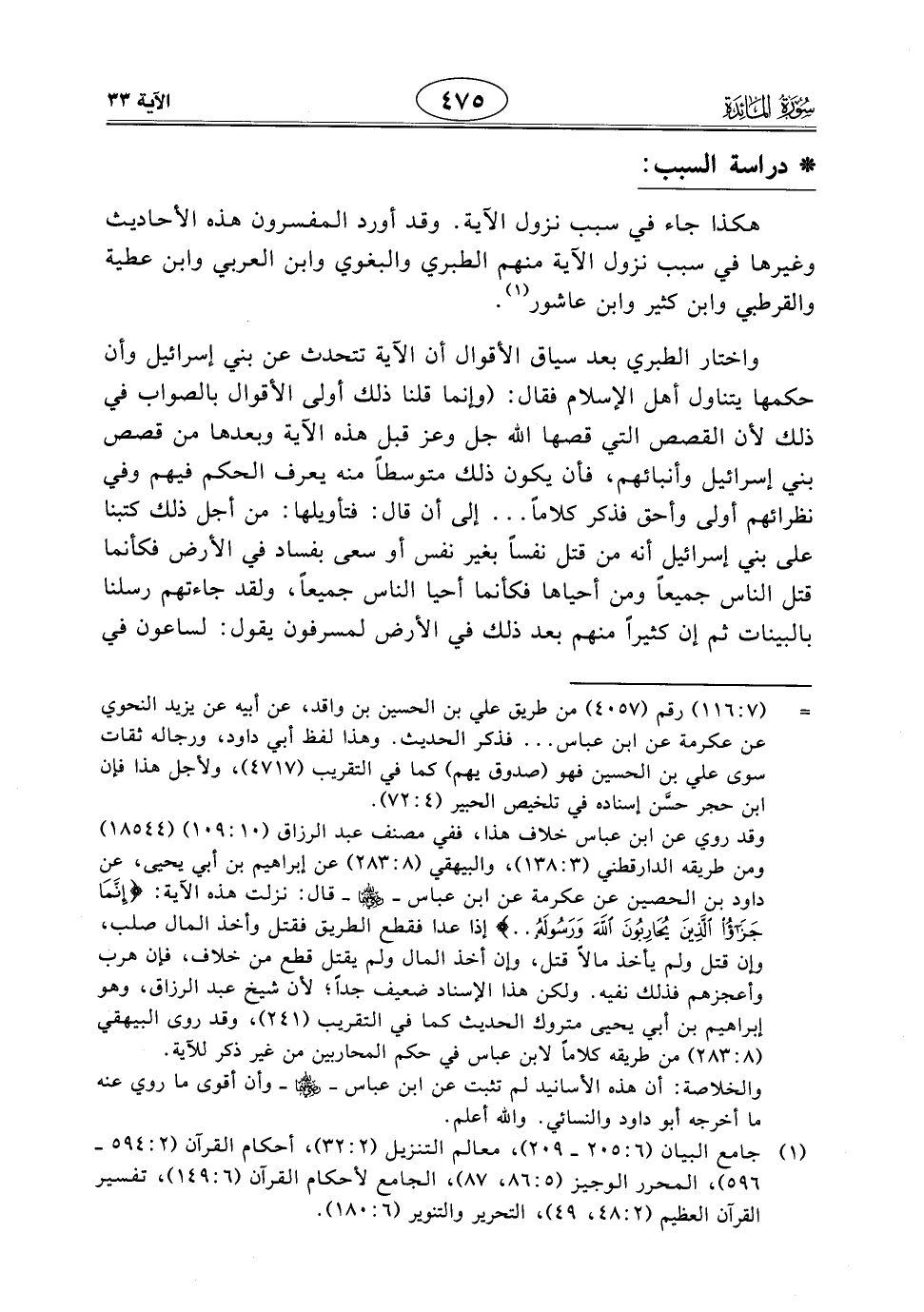 واختار الطبري بعد سياق الأقوال أن الآية تتحدث عن بني إسرائيل وأن حكمها يتناول أهل الإسلام فقال: (وإنما قلنا ذلك أولى الأقوال بالصواب في ذلك لأن القصص التي قصها اللَّه جل وعز قبل هذه الآية وبعدها من قصص بني إسرائيل وأنبائهم، فأن يكون ذلك متوسطاً منه يعرف الحكم فيهم وفي نظرائهم أولى وأحق فذكر كلامًا ... إلى أن قال: فتأويلها: من أجل ذلك كتبنا على بني إسرائيل أنه من قتل نفساً بغير نفس أو سعى بفساد في الأرض فكأنما قتل الناس جميعاً ومن أحياها فكأنما أحيا الناس جميعاً، ولقد جاءتهم رسلنا بالبينات ثم إن كثيرًا منهم بعد ذلك في الأرض لمسرفون يقول: لساعون في