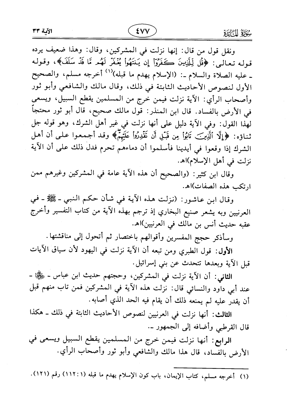 ونقل قول من قال: إنها نزلت في المشركين، وقال: وهذا ضعيف يرده قوله تعالى: (قُلْ لِلَّذِينَ كَفَرُوا إِنْ يَنْتَهُوا يُغْفَرْ لَهُمْ مَا قَدْ سَلَفَ)، وقوله - عليه الصلاة والسلام -: (الإسلام يهدم ما قبله) أخرجه مسلم، والصحيح الأول لنصوص الأحاديث الثابتة في ذلك، وقال مالك والشافعي وأبو ثور وأصحاب الرأي: الآية نزلت فيمن خرج من المسلمين يقطع السبيل، ويسعى في الأرض بالفساد. قال ابن المنذر: قول مالك صحيح، قال أبو ثور محتجاً لهذا القول: وفي الآية دليل على أنها نزلت في غير أهل الشرك، وهو قوله جل ثناؤه: (إِلَّا الَّذِينَ تَابُوا مِنْ قَبْلِ أَنْ تَقْدِرُوا عَلَيْهِمْ) وقد أجمعوا على أن أهل الشرك إذا وقعوا في أيدينا فأسلموا أن دماءهم تحرم فدل ذلك على أن الآية نزلت في أهل الإسلام) اهـ.