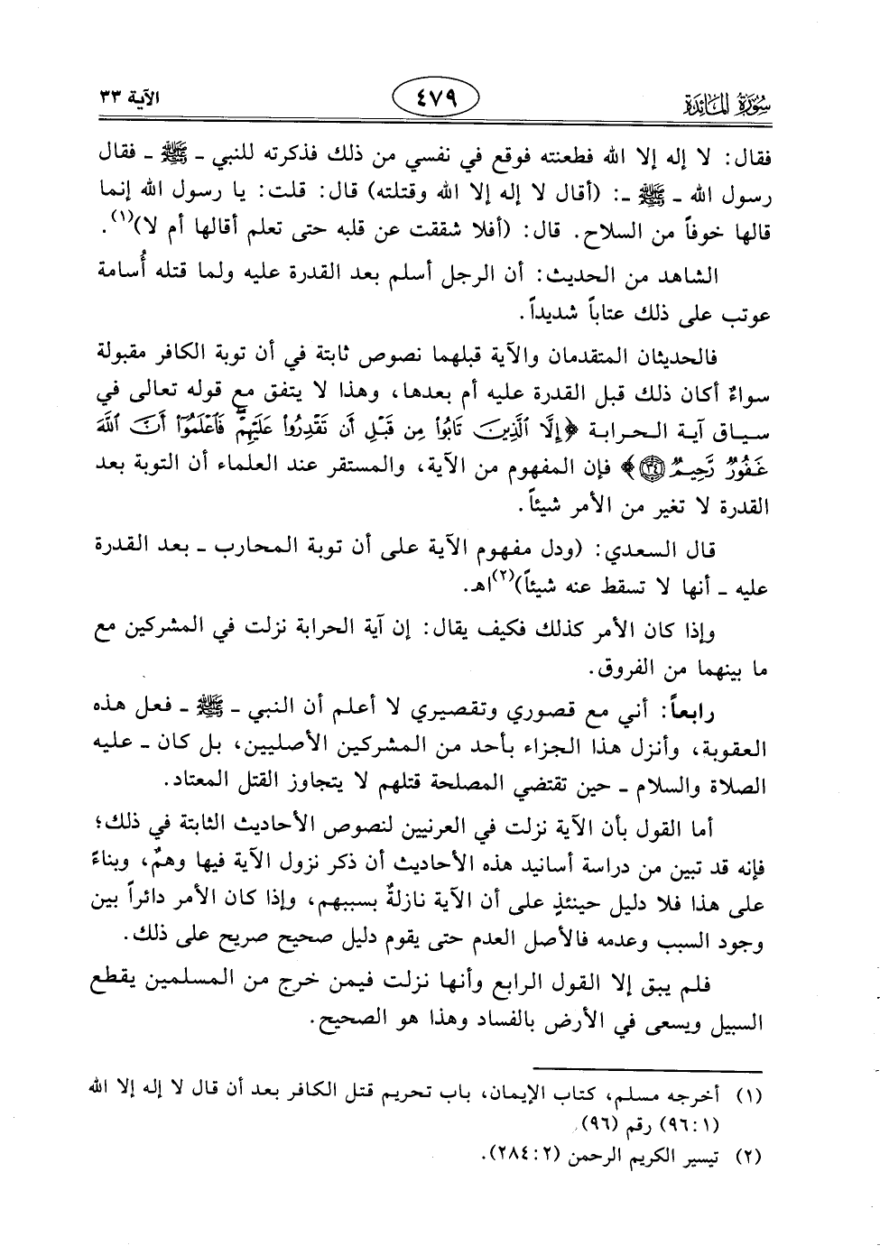 فالحديثان المتقدمان والآية قبلهما نصوص ثابتة في أن توبة الكافر مقبولة سواء أكان ذلك قبل القدرة عليه أم بعدها، وهذا لا يتفق مع قوله تعالى في سياق آية الحرابة (إِلَّا الَّذِينَ تَابُوا مِنْ قَبْلِ أَنْ تَقْدِرُوا عَلَيْهِمْ فَاعْلَمُوا أَنَّ اللَّهَ غَفُورٌ رَحِيمٌ) فإن المفهوم من الآية، والمستقر عند العلماء أن التوبة بعد القدرة لا تغير من الأمر شيئاً.