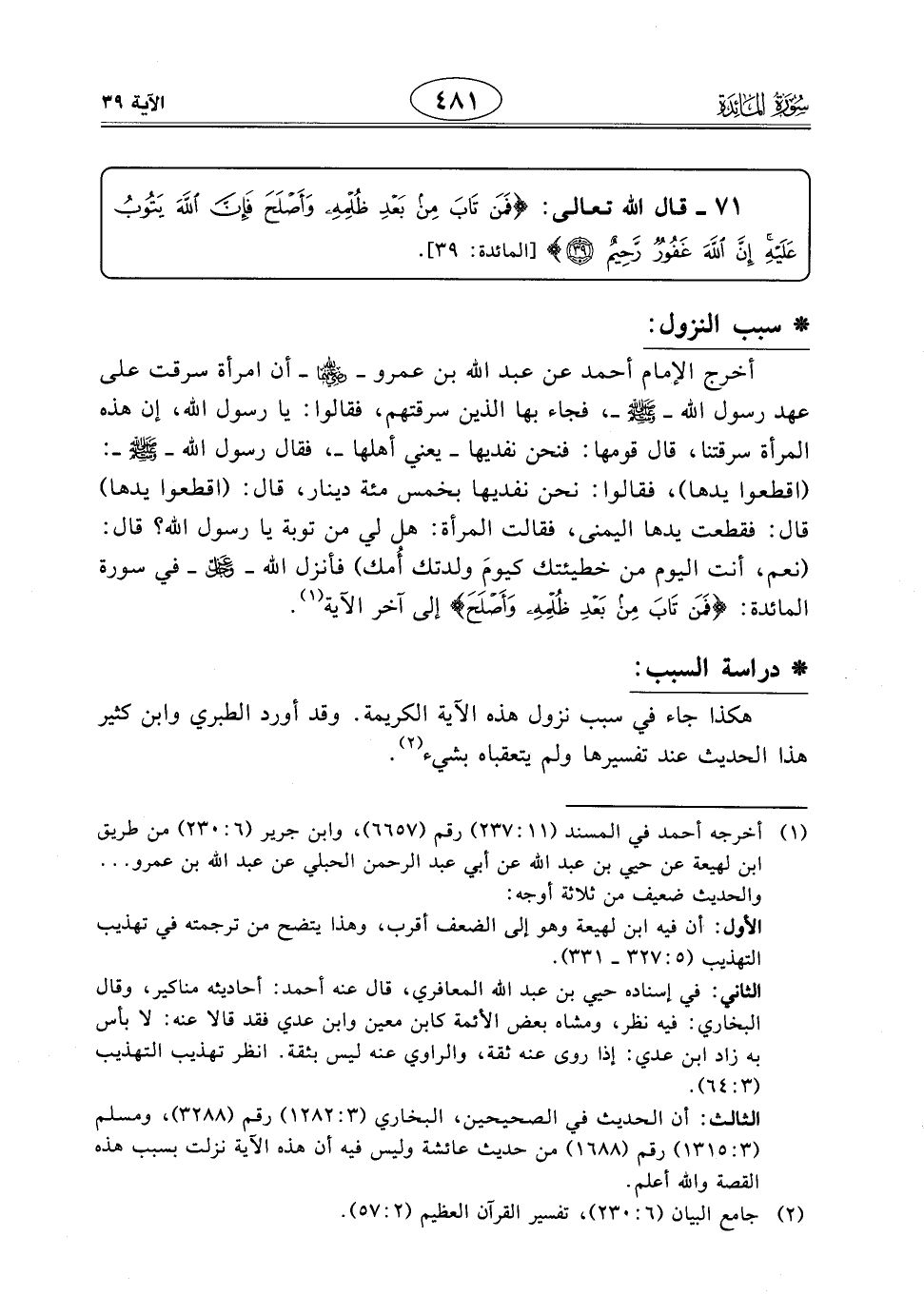 أخرج الإمام أحمد عن عبد الله بن عمرو - رَضِيَ اللَّهُ عَنْهُ - أن امرأة سرقت على عهد رسول الله - صَلَّى اللَّهُ عَلَيْهِ وَسَلَّمَ -، فجاء بها الذين سرقتهم، فقالوا: يا رسول اللَّه، إن هذه المرأة سرقتنا، قال قومها: فنحن نفديها - يعني أهلها -، فقال رسول الله - صَلَّى اللَّهُ عَلَيْهِ وَسَلَّمَ -: (اقطعوا يدها)، فقالوا: نحن نفديها بخمس مائة دينار، قال: (اقطعوا يدها) قال: فقطعت يدها اليمنى، فقالت المرأة: هل لي من توبة يا رسول اللَّه؟ قال: (نعم، أنت اليوم من خطيئتك كيومَ ولدتك أُمك) فأنزل الله - عَزَّ وَجَلَّ - في سورة المائدة: (فَمَنْ تَابَ مِنْ بَعْدِ ظُلْمِهِ وَأَصْلَحَ) إلى آخر الآية.