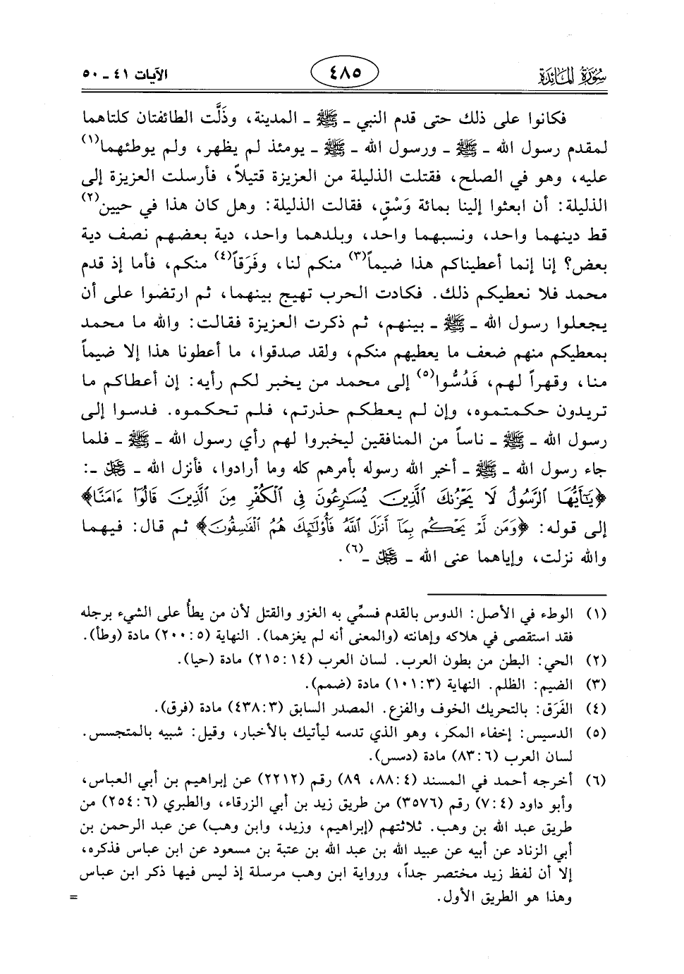 فكانوا على ذلك حتى قدم النبي - صَلَّى اللَّهُ عَلَيْهِ وَسَلَّمَ - المدينة، وذَلَّت الطائفتان كلتاهما لمقدم رسول اللَّه - صَلَّى اللَّهُ عَلَيْهِ وَسَلَّمَ - ورسول اللَّه - صَلَّى اللَّهُ عَلَيْهِ وَسَلَّمَ - يومئذ لم يظهر، ولم يوطئهما عليه، وهو في الصلح، فقتلت الذليلة من العزيزة قتيلاً، فأرسلت العزيزة إلى الذليلة: أن ابعثوا إلينا بمائة وَسْقِ، فقالت الذليلة: وهل كان هذا في حيين قط دينهما واحد، ونسبهما واحد، وبلدهما واحد، دية بعضهم نصف دية بعض؟ إنا إنما أعطيناكم هذا ضيماً منكم لنا، وفَرَقاً منكم، فأما إذ قدم محمد فلا نعطيكم ذلك. فكادت الحرب تهيج بينهما، ثم ارتضوا على أن يجعلوا رسول اللَّه - صَلَّى اللَّهُ عَلَيْهِ وَسَلَّمَ - بينهم، ثم ذكرت العزيزة فقالت: والله ما محمد بمعطيكم منهم ضعف ما يعطيهم منكم، ولقد صدقوا، ما أعطونا هذا إلا ضيماً منا، وقهراً لهم، فَدُسُّوا إلى محمد من يخبر لكم رأيه: إن أعطاكم ما تريدون حكمتموه، وإن لم يعطكم حذرتم، فلم تحكموه. فدسوا إلى رسول اللَّه - صَلَّى اللَّهُ عَلَيْهِ وَسَلَّمَ - ناساً من المنافقين ليخبروا لهم رأي رسول اللَّه - صَلَّى اللَّهُ عَلَيْهِ وَسَلَّمَ - فلما جاء رسول الله - صَلَّى اللَّهُ عَلَيْهِ وَسَلَّمَ - أخبر اللَّه رسوله بأمرهم كله وما أرادوا، فأنزل اللَّه - عَزَّ وَجَلَّ -: (يَا أَيُّهَا الرَّسُولُ لَا يَحْزُنْكَ الَّذِينَ يُسَارِعُونَ فِي الْكُفْرِ مِنَ الَّذِينَ قَالُوا آمَنَّا) إلى قوله: (وَمَنْ لَمْ يَحْكُمْ بِمَا أَنْزَلَ اللَّهُ فَأُولَئِكَ هُمُ الْفَاسِقُونَ) ثم قال: فيهما واللَّه نزلت، وإياهما عنى اللَّه - عَزَّ وَجَلَّ -.