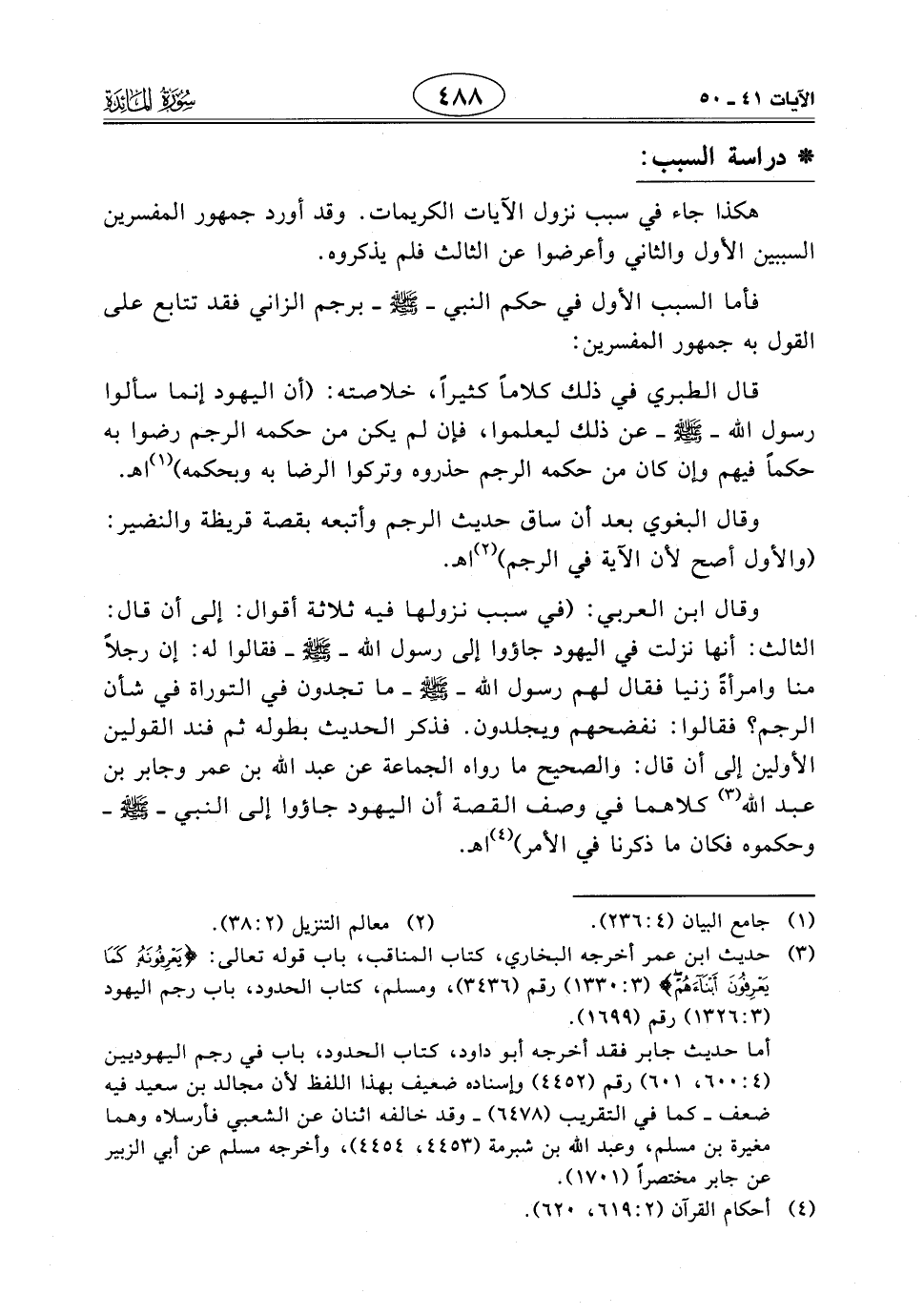 وقال ابن العربي: (فى سبب نزولها فيه ثلاثة أقوال: إلى أن قال: الثالث: أنها نزلت في اليهود جاؤوا إلى رسول الله - صَلَّى اللَّهُ عَلَيْهِ وَسَلَّمَ - فقالوا له: إن رجلاً منا وامرأةً زنيا فقال لهم رسول اللَّه - صَلَّى اللَّهُ عَلَيْهِ وَسَلَّمَ - ما تجدون في التوراة في شأن الرجم؟ فقالوا: نفضحهم ويجلدون. فذكر الحديث بطوله ثم فند القولين الأولين إلى أن قال: والصحيح ما رواه الجماعة عن عبد اللَّه بن عمر وجابر بن عبد الله كلاهما في وصف القصة أن اليهود جاؤوا إلى النبي - صَلَّى اللَّهُ عَلَيْهِ وَسَلَّمَ - وحكموه فكان ما ذكرنا في الأمر) اهـ.