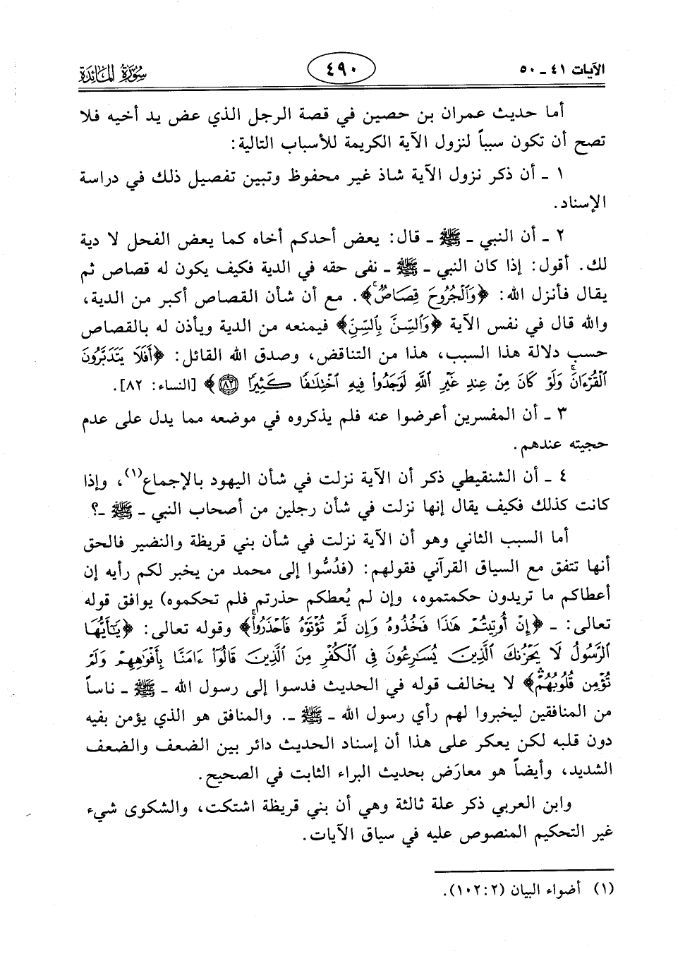 أما السبب الثاني وهو أن الآية نزلت في شأن بني قريظة والنضير فالحق أنها تتفق مع السياق القرآني فقولهم: (فدُسُّوا إلى محمد من يخبر لكم رأيه إن أعطاكم ما تريدون حكمتموه، وإن لم يُعطكم حذرتم فلم تحكموه) يوافق قوله تعالى: - (إِنْ أُوتِيتُمْ هَذَا فَخُذُوهُ وَإِنْ لَمْ تُؤْتَوْهُ فَاحْذَرُوا) وقوله تعالى: (يَا أَيُّهَا الرَّسُولُ لَا يَحْزُنْكَ الَّذِينَ يُسَارِعُونَ فِي الْكُفْرِ مِنَ الَّذِينَ قَالُوا آمَنَّا بِأَفْوَاهِهِمْ وَلَمْ تُؤْمِنْ قُلُوبُهُمْ) لا يخالف قوله في الحديث فدسوا إلى رسول الله - صَلَّى اللَّهُ عَلَيْهِ وَسَلَّمَ - ناساً من المنافقين ليخبروا لهم رأي رسول اللَّه - صَلَّى اللَّهُ عَلَيْهِ وَسَلَّمَ -. والمنافق هو الذي يؤمن بفيه دون قلبه لكن يعكر على هذا أن إسناد الحديث دائر بين الضعف والضعف الشديد، وأيضاً هو معارَض بحديث البراء الثابت في الصحيح.