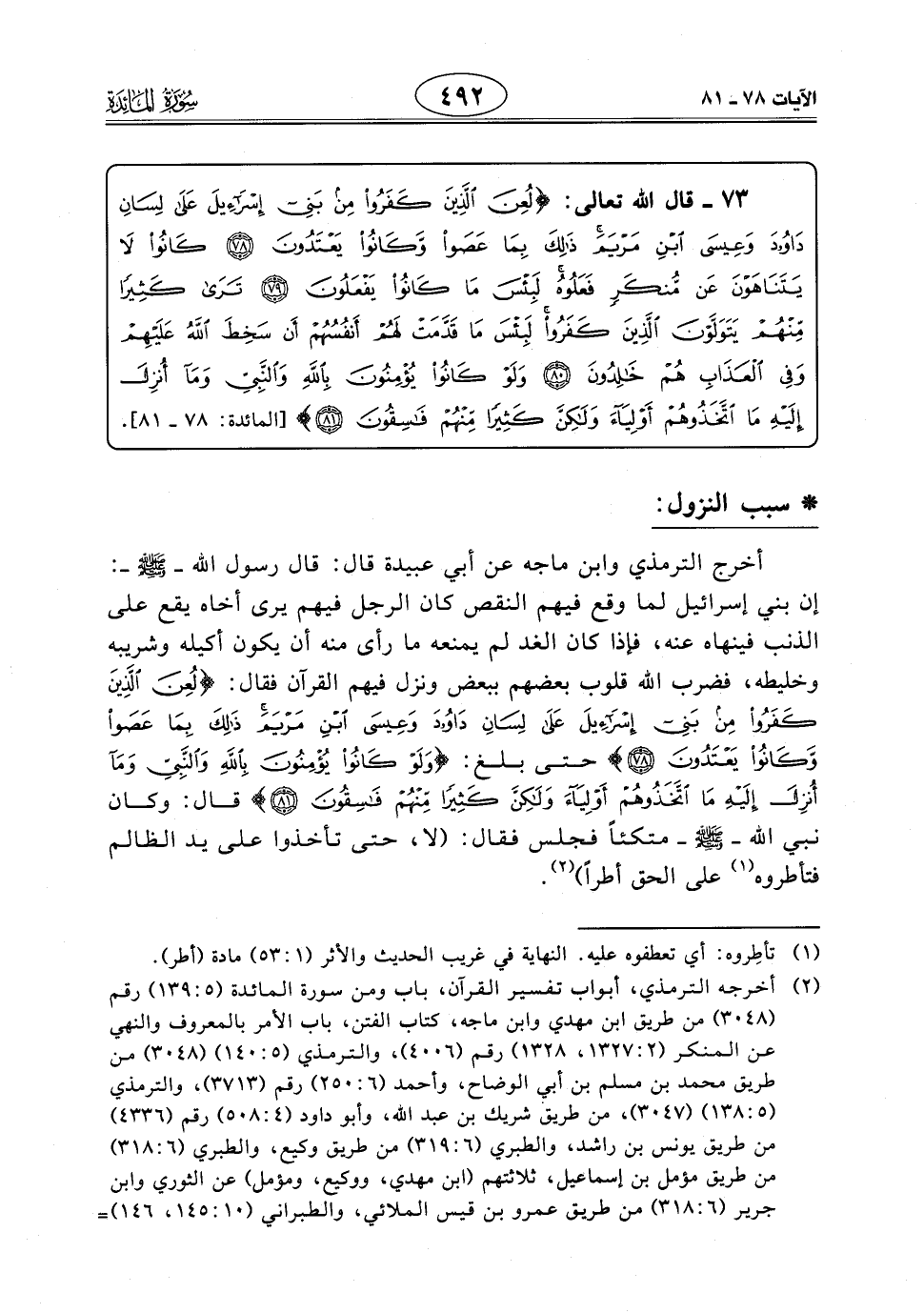 أخرج الترمذي وابن ماجه عن أبي عبيدة قال: قال رسول اللَّه - صَلَّى اللَّهُ عَلَيْهِ وَسَلَّمَ -: إن بني إسرائيل لما وقع فيهم النقص كان الرجل فيهم يرى أخاه يقع على الذنب فينهاه عنه، فإذا كان الغد لم يمنعه ما رأى منه أن يكون أكيله وشريبه وخليطه، فضرب الله قلوب بعضهم ببعض ونزل فيهم القرآن فقال: (لُعِنَ الَّذِينَ كَفَرُوا مِنْ بَنِي إِسْرَائِيلَ عَلَى لِسَانِ دَاوُودَ وَعِيسَى ابْنِ مَرْيَمَ ذَلِكَ بِمَا عَصَوْا وَكَانُوا يَعْتَدُونَ) حتى بلغ: (وَلَوْ كَانُوا يُؤْمِنُونَ بِاللَّهِ وَالنَّبِيِّ وَمَا أُنْزِلَ إِلَيْهِ مَا اتَّخَذُوهُمْ أَوْلِيَاءَ وَلَكِنَّ كَثِيرًا مِنْهُمْ فَاسِقُونَ) قال: وكان نبي اللَّه - صَلَّى اللَّهُ عَلَيْهِ وَسَلَّمَ - متكئًا فجلس فقال: (لا، حتى تأخذوا على يد الظالم فتأطروه على الحق أطراً).
