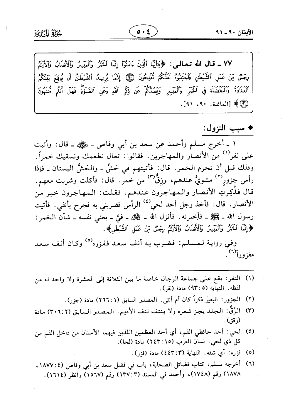 1 - أخرج مسلم وأحمد عن سعد بن أبي وقاص - رَضِيَ اللَّهُ عَنْهُ - قال: وأتيت على نفر من الأنصار والمهاجرين. فقالوا: تعال نطعمك ونسقيك خمراً. وذلك قبل أن تحرم الخمر. قال: فأتيتهم في حَشٍّ - والحَشُّ البستان - فإذا رأس جزورٍ مشوي عندهم، وزِقٌّ من خمر. قال: فأكلت وشربت معهم. قال فذُكِرتِ الأنصار والمهاجرون عندهم. فقلت: المهاجرون خير من الأنصار. قال: فأخذ رجل أحد لحي الرأس فضربني به فجرح بأنفي. فأتيت رسول اللَّه - صَلَّى اللَّهُ عَلَيْهِ وَسَلَّمَ - فأخبرته. فأنزل الله - عَزَّ وَجَلَّ - فيَّ - يعني نفسه - شأن الخمر: (إِنَّمَا الْخَمْرُ وَالْمَيْسِرُ وَالْأَنْصَابُ وَالْأَزْلَامُ رِجْسٌ مِنْ عَمَلِ الشَّيْطَانِ).